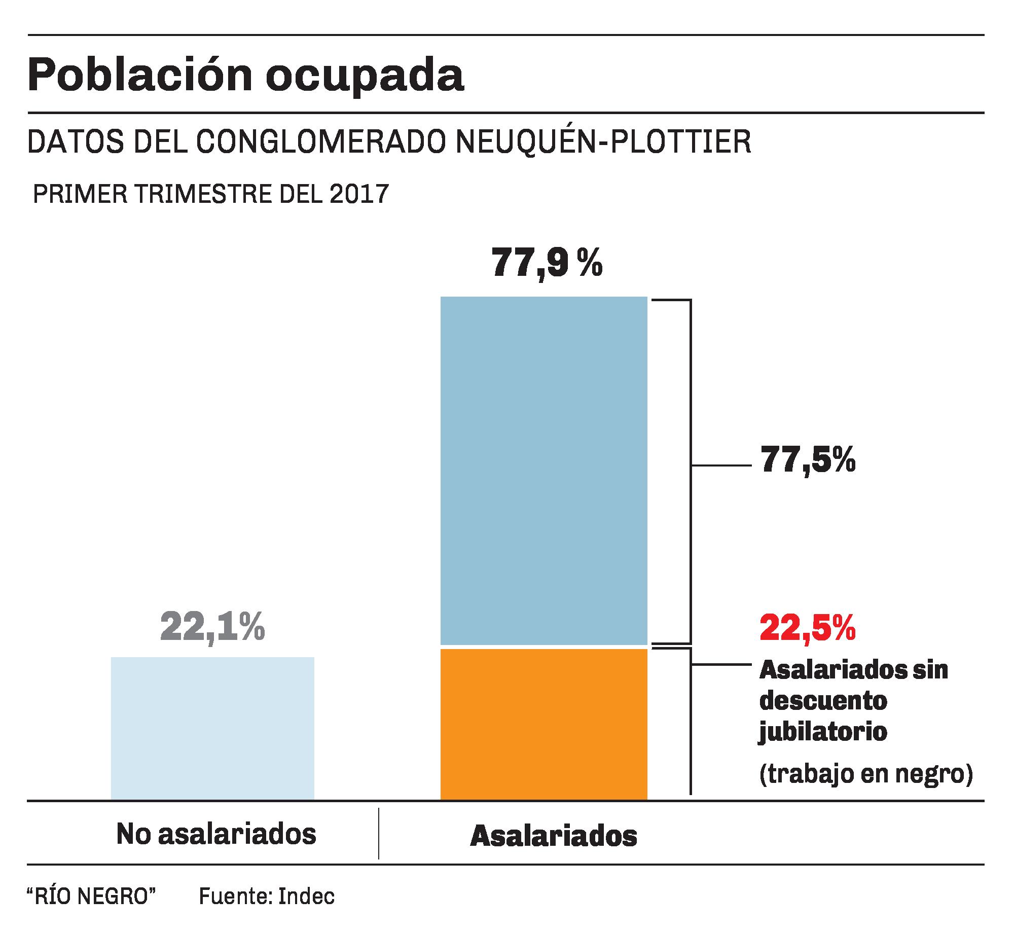 El porcentaje de asalariados que no cuentan con aportes jubilatorios, lo que comúnmente se denomina empleo informal, fue de 22,5% en el primer trimestre del año en el conglomerado Neuquén-Plottier. La cifra superó el promedio de la región patagónica que llegó a 18,9%.