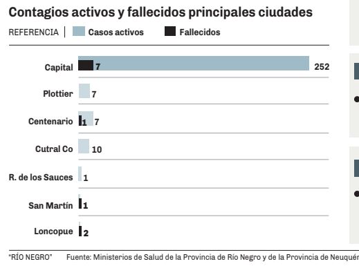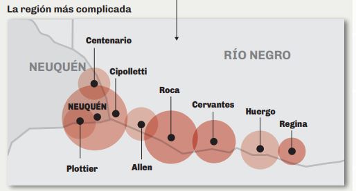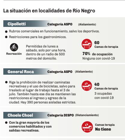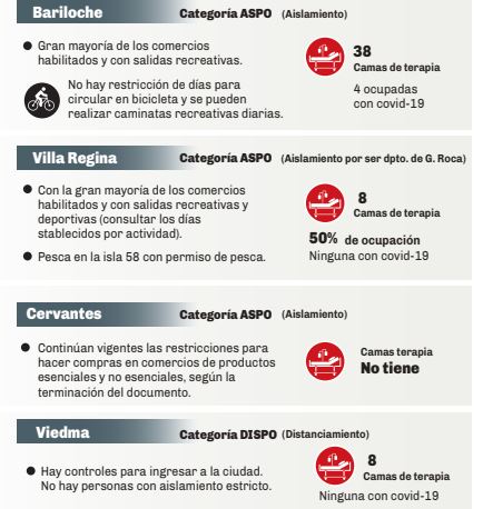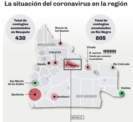 En Río Negro, el primer contagio fue en Viedma, luego hubo que imponer un cordón sanitario en el Valle Medio, Bariloche tuvo el primer foco institucional de contagios (la PSA) y el Alto Valle tiene a sus dos principales ciudades con circulación comunitaria del virus. La Región Sur también se vio afectada recientemente, con un brote que obligó al cordón sanitario en Jacobacci.