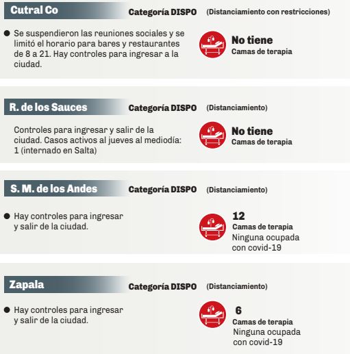 Una semana después se inició la transmisión en conglomerado en Las Lajas con un hombre de 69 años de La Buitrera, quien falleció la semana pasada. Luego se aisló Loncopué por un brote de 36 casos, debido a reuniones gastronómicas que originaron los contagios. Tras varias semanas de relativa calma, el 3 de junio se confirmaron 32 casos derivados de la subcomisaría 82 de Las Perlas a los que se agregaron los 76 casos, hasta ayer, originados en el policlínico ADOS, que desde el 9 de junio no recibe más pacientes.