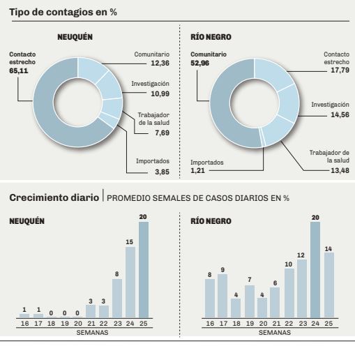 Río Negro tuvo sobresaltos en todas sus regiones: el primer caso en Viedma, el cordón sanitario en Valle Medio, luego Bariloche y ahora en el Alto Valle. Neuquén pasó por la sorpresa de Las Lajas y Loncopué, dos meses casi sin casos y el rebrote en la capital.