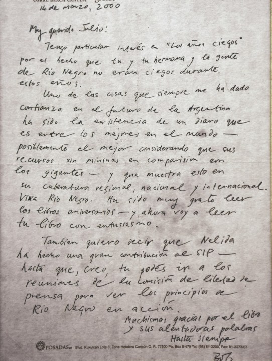 La carta está fechada el 14 de marzo del 2000. Robert Cox, ex editor del Buenos Aires Herald, prestigioso y valiente periodista inglés que denunció las atrocidades de la dictadura militar, fue detenido en forma ilegal y debió abandonar el país en 1979, le escribe a Julio Rajneri, ex director de Río Negro, en ocasión de la publicación de su libro “Los años ciegos”, que recopila editoriales y artículos de los años de plomo: “Tengo profundo interés en leerlo por el hecho que tu y tu hermana (Nélida) y la gente de Río Negro no eran ciegos durante estos años”.