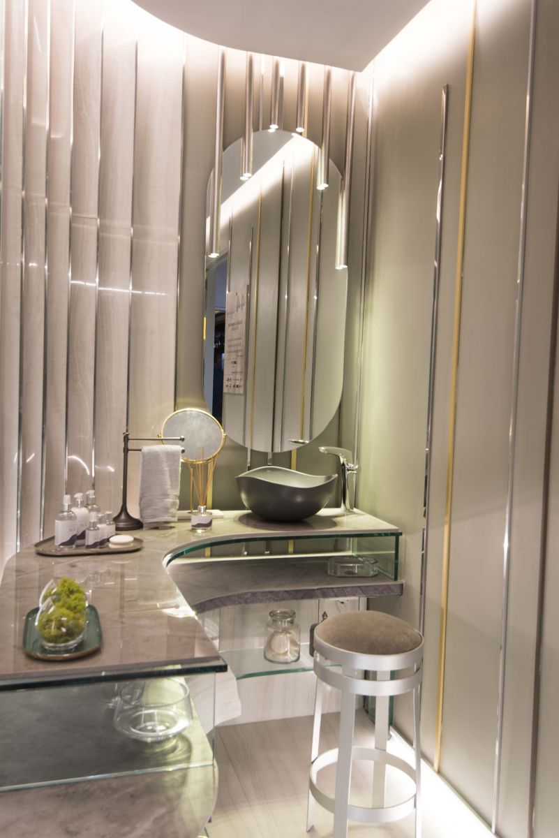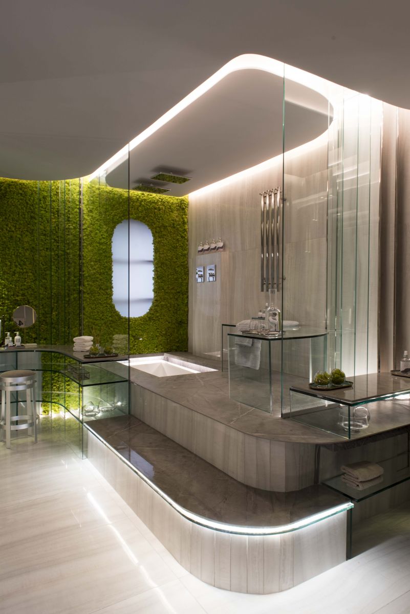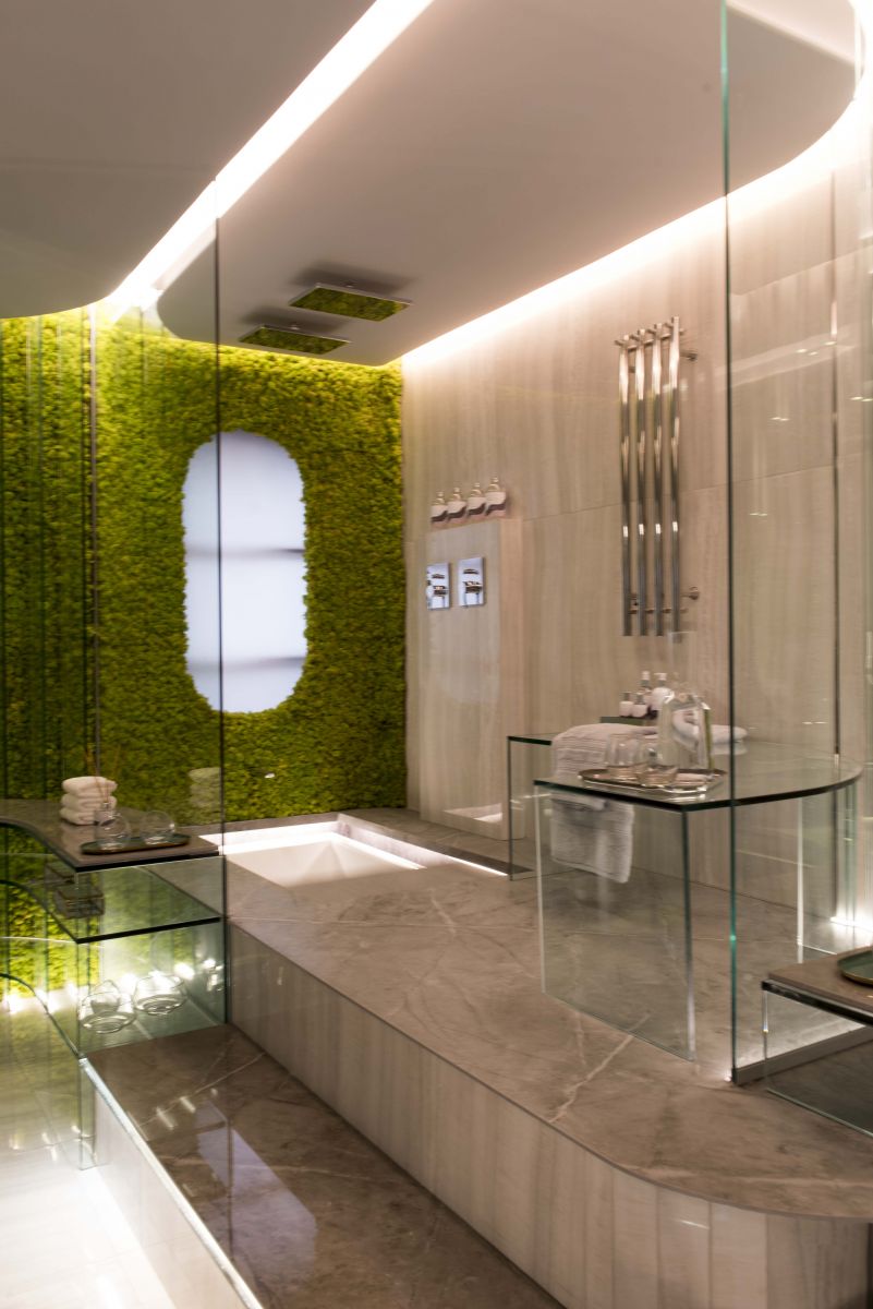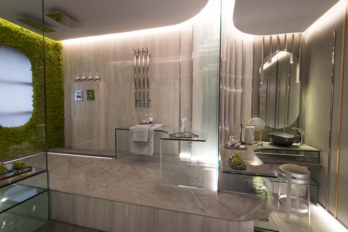 – Una gran curva realizada con una estructura de aceros Ternium se eleva generando un sector de ducha para dos personas que -de forma automatizada optimiza el espacio-se convierte en hidromasaje.