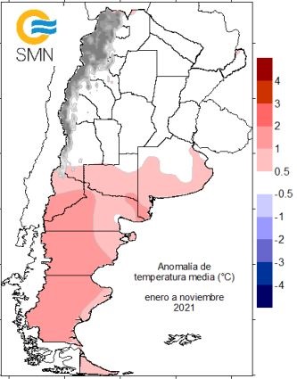 Las temperaturas fueron superiores a lo normal todo el año en la Patagonia, excepto al comienzo del 2021 que registró una débil anomalía negativa en el este patagónico. «El año finalizó, en promedio, con valores de entre 1 y 2 °C más que un año típico. Abril, septiembre y diciembre se caracterizaron por ser los más calurosos y los meses que más récords de temperatura se batieron en esta región», señaló @cindymfernandez, comunicadora meteorológica del SMN en el sitio meteored.com.