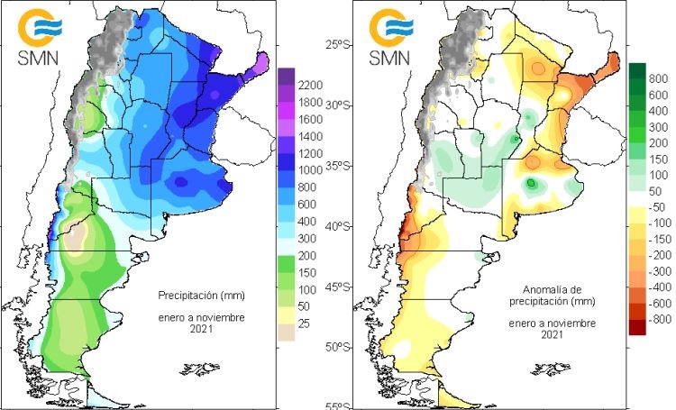 En los mapas se puede advertir como el déficit de las precipitaciones es muy marcado en la zona cordillera de Neuquén y Río Negro, lo que se evidencia en las falta agua en los principales embalses ubicados en la cuenca del Limay.