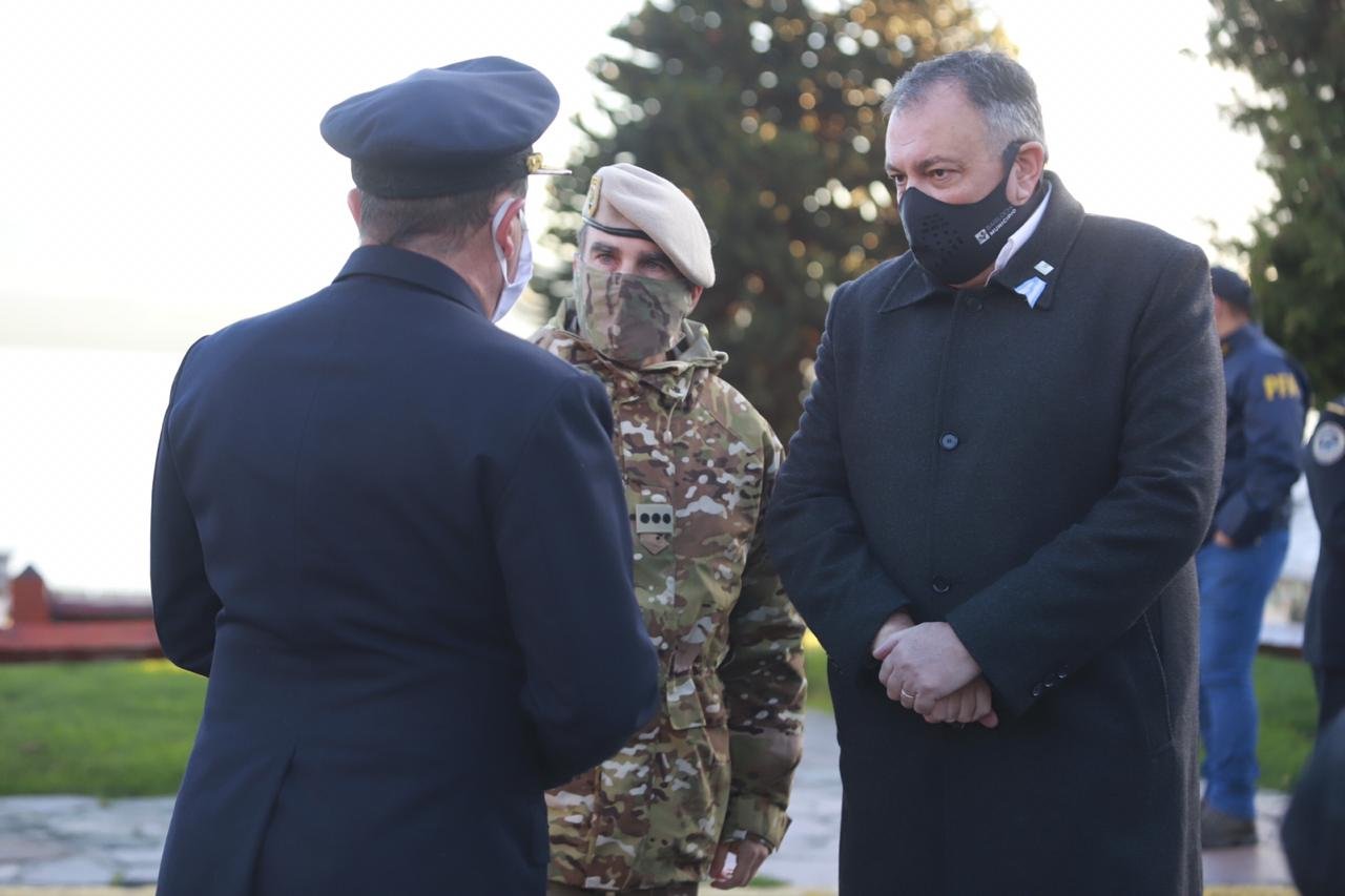 El jefe comunal junto a un puñado de autoridades municipales del gabinete y concejales participaron del acto sin público que se centró en el izamiento de la bandera argentina acompañado por los acordes de la banda.