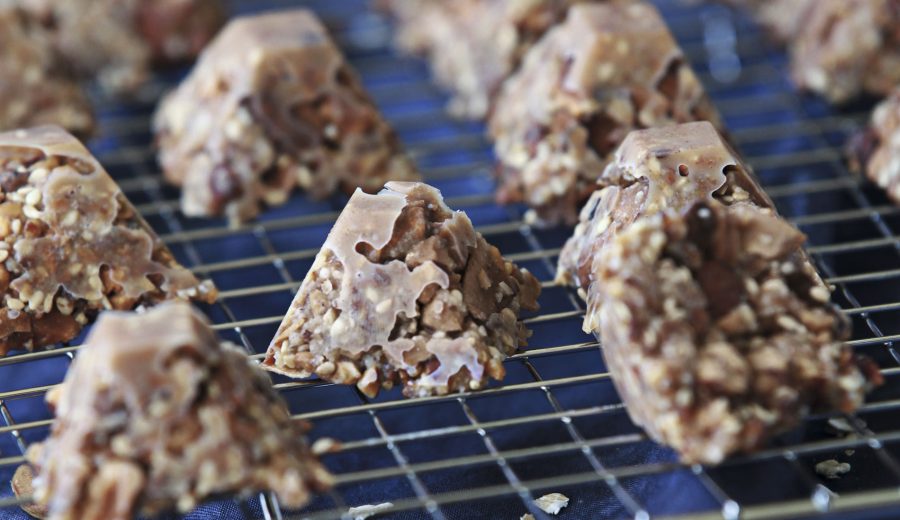 Precalentar el horno a 160° 2. En una procesadora mezclar las almendras, las semillas de zapallo y las de sésamo hasta formar trozos pequeños. Incorporar el maní, las láminas de coco y 1/3 del aceite de coco derretido. Verter en una lámina de silicona y hornear por 15 a 20 minutos o hasta que todo esté tostado. Sacar del horno y luego mezclar con 1/3 del aceite de coco, la harina de almendras, el syrup de arroz integral, la canela, la vainilla, la sal y revolver bien. Verter en una fuente rectangular y presionar bien. Enfriar por al menos 1 hora o idealmente de un día para otro.