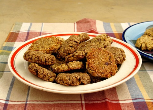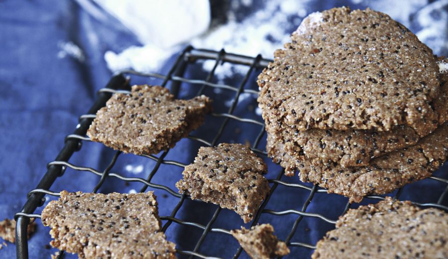 En una procesadora, moler los frutos secos hasta obtener una harina. Agregar el resto de los ingredientes y luego verter ¼ taza de agua. Mezclar todo hasta obtener una masa pegajosa. Formar galletas bien delgadas y hornear por 20 minutos o hasta que estén ligeramente doradas.