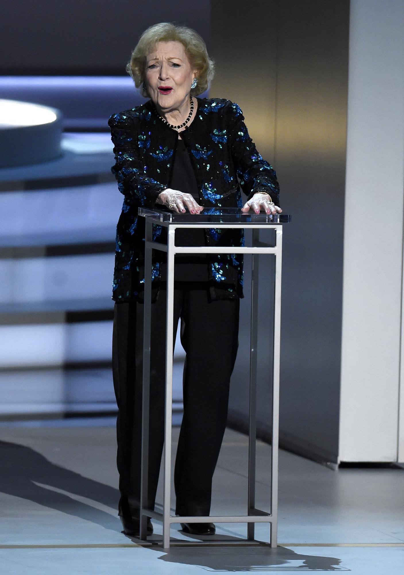 Betty White fue ovacionada de pie al ser honrada por sus más de 80 años en televisión.