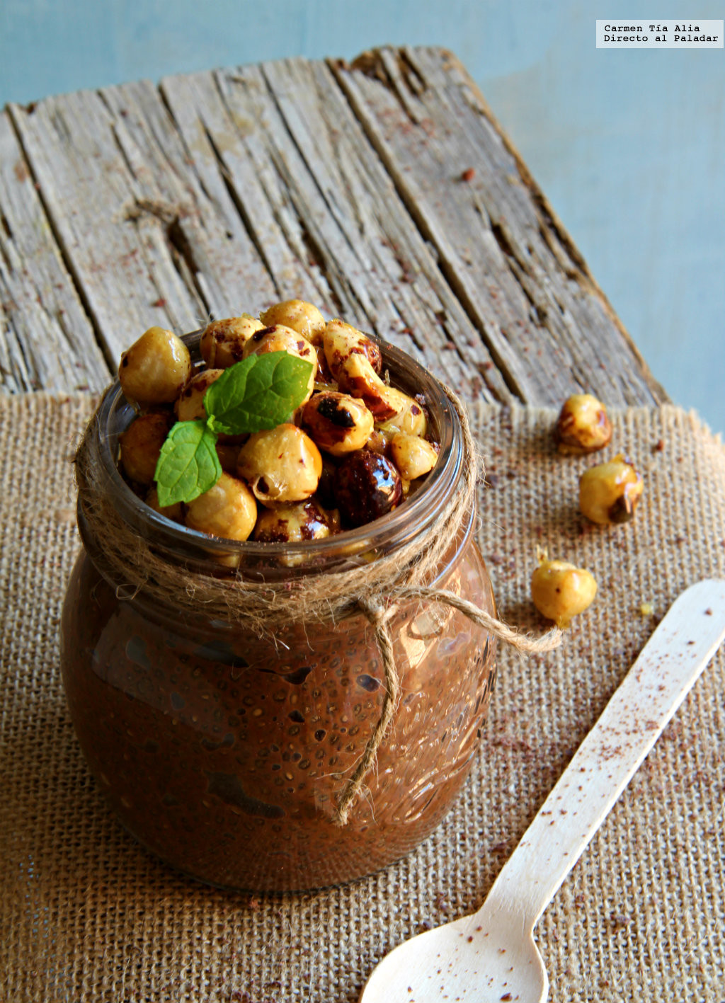 Si queremos servir el pudding como postre se pueden preparar unas avellanas caramelizadas. En un sartén o cacerola calentar el azúcar a fuego medio e incorporar las avellanas peladas cuando este comience a caramelizarse. Remover para que se cubran de caramelo por todos sus lados y dejar enfriar sobre papel sulfurizado antes de usar para decorar.