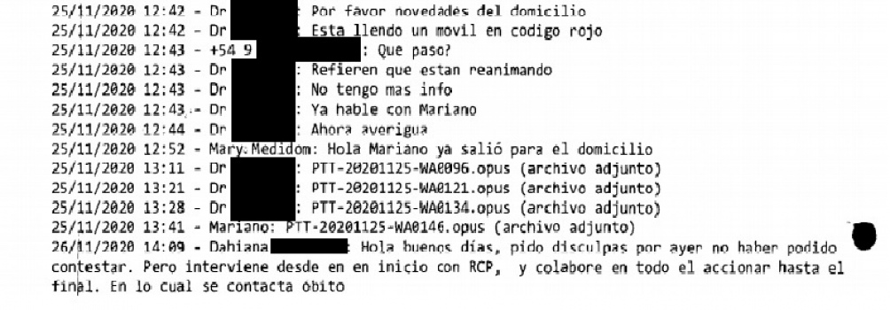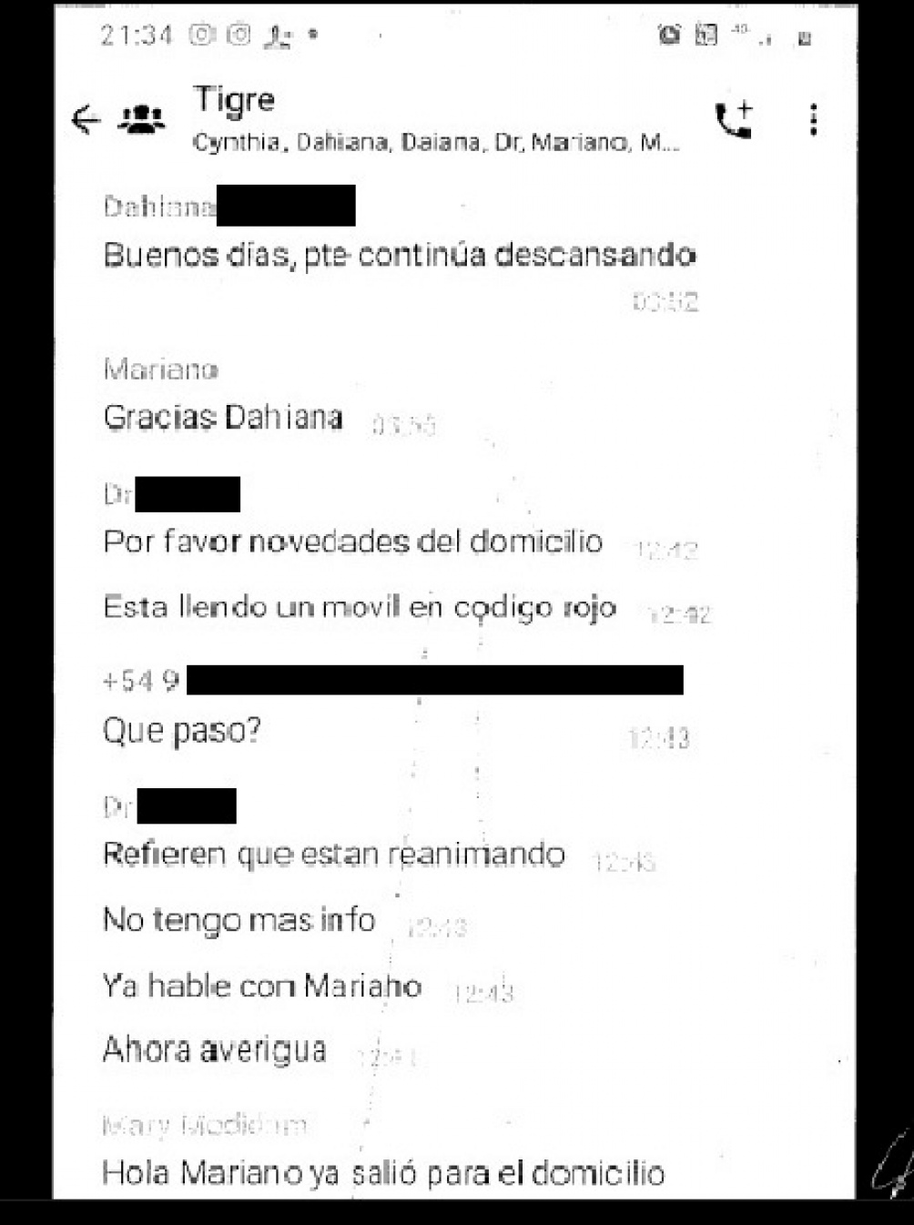 El chat fue creado para que los enfermeros de la empresa «Medidom» que cuidaron al «10» reportaran a sus superiores y a los médicos coordinadores de la prepaga Swiss Medical, el parte diario y cualquier eventualidad que surgiera en la casa del barrio San Andrés de Tigre.