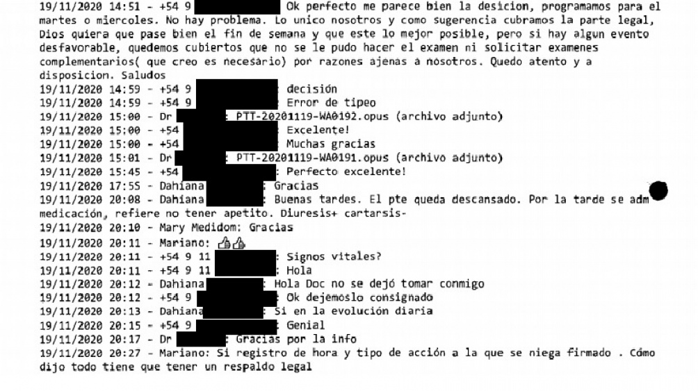 Incluso, el único médico clínico que llegó a ver una sola vez a Maradona en Tigre mostró su preocupación por lo dificultoso que era Diego como paciente al afirmar en este chat: «Cubramos la parte legal».