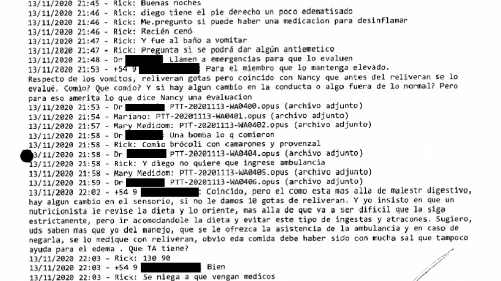 Los diálogos -aportados por el enfermero imputado Ricardo Almirón- son parte de los elementos que analizaron los fiscales para sostener la hipótesis de que esa internación domiciliaria tuvo falencias que pudieron haber derivado en la muerte del «10» y, por lo tanto, en un posible «homicidio culposo».