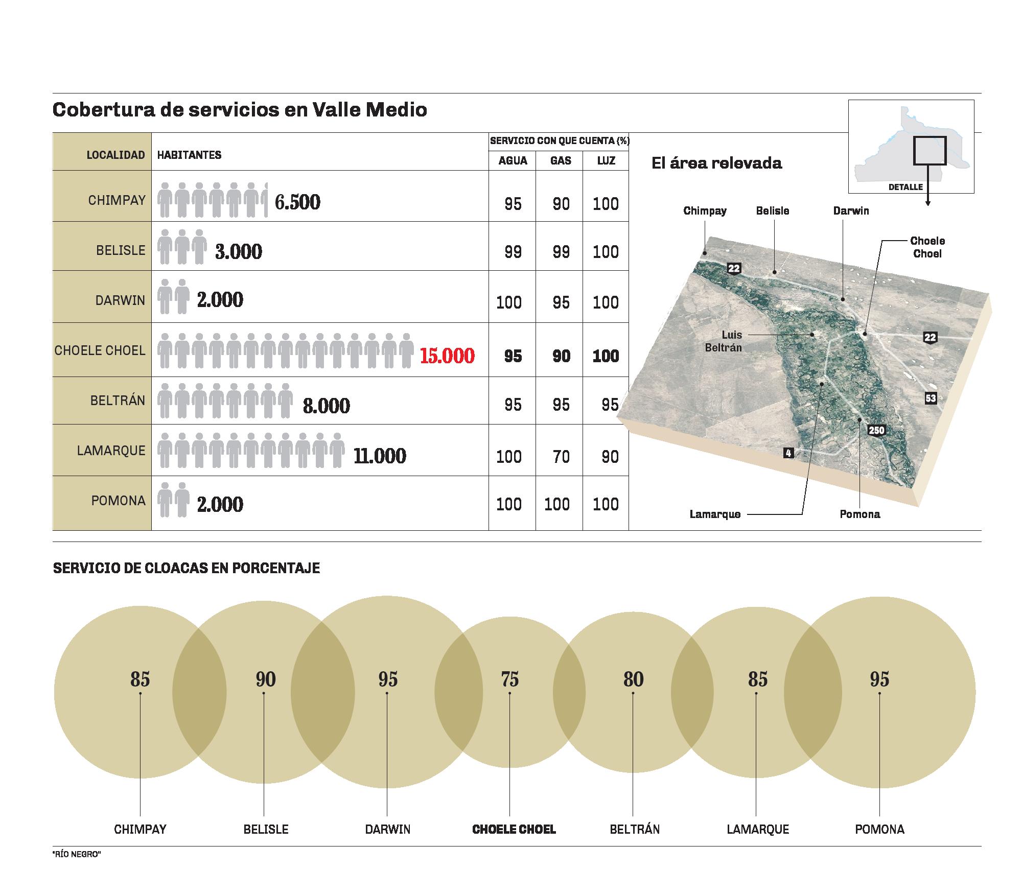 Le sigue en el ranking de cobertura la electricidad; un servicio que llega al 95% del total de los habitantes del Valle Medio. Por último, un 87% presenta el gas y un 82% las cloacas.