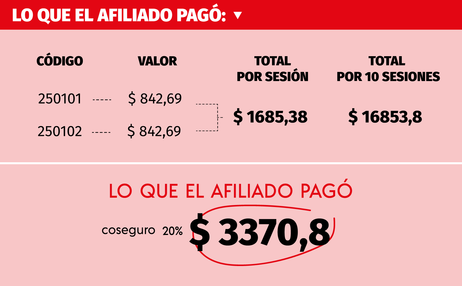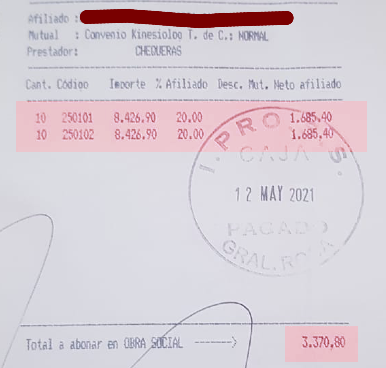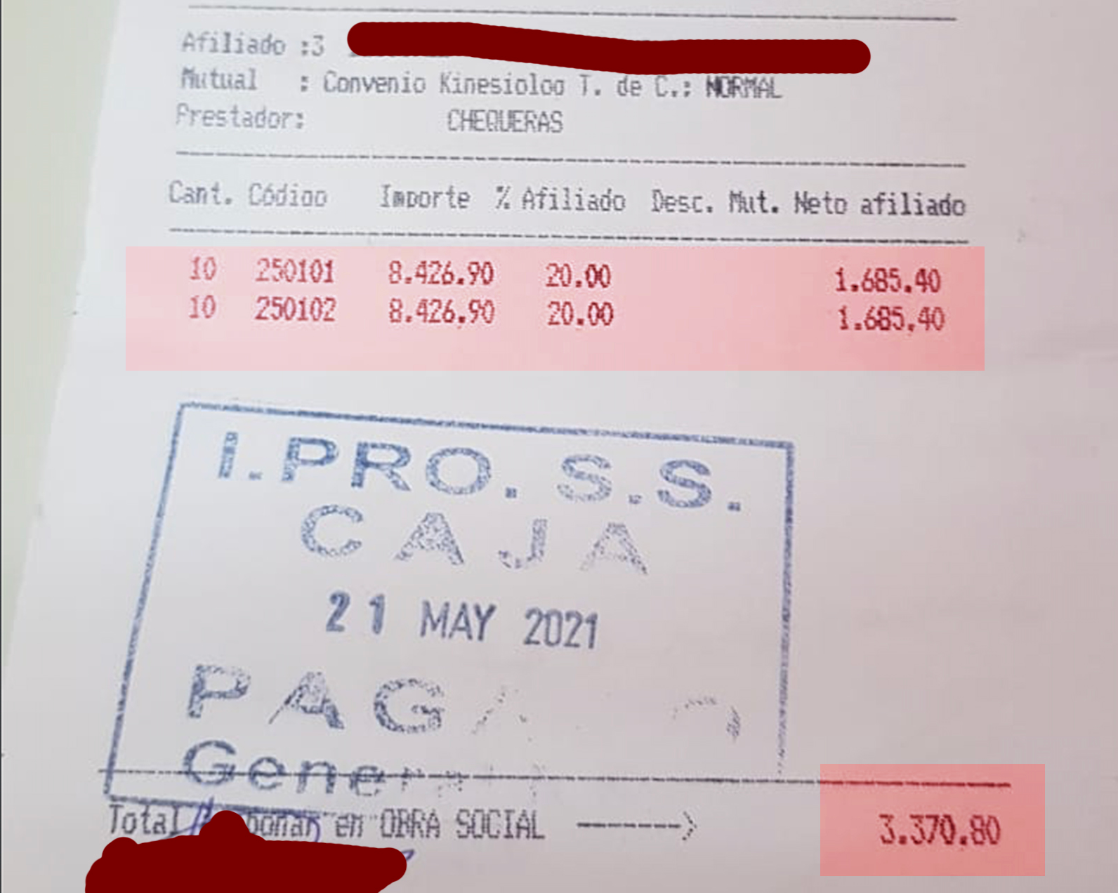 Ese monto no tiene relación lógica con el pago que le exigieron a otro afiliado el 12 de mayo, en la misma oficina, por 10 sesiones bajo los mismos códigos mencionados. Siguiendo el caso anterior, por el doble de atenciones debería haber abonado 2.130,90 pesos, pero el desembolso que tuvo que hacer fue de 3.370,80 pesos.