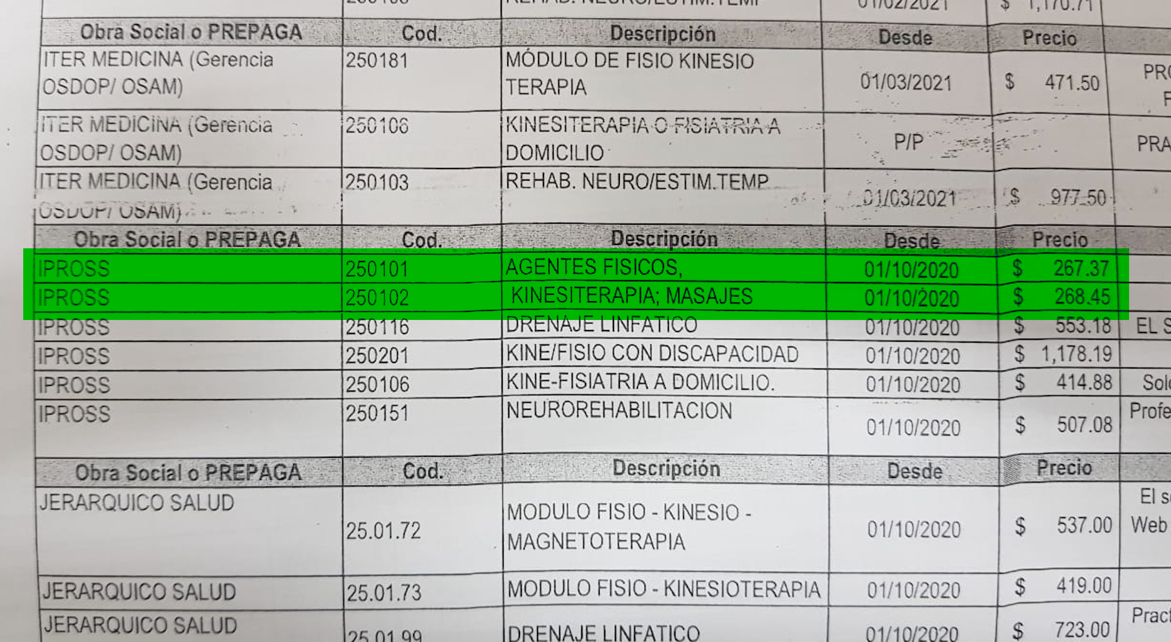 De acuerdo con lo explicado por profesionales de la especialidad, el Ipross paga cada sesión de manera dividida, estableciendo dos códigos en su nomenclador: 250101 para “agentes físicos” y 250102 para “kinesiterapia-masajes”. El valor reconocido para la primera es de 267,37 pesos, en tanto que para la segunda se asignan 268,45 pesos, conformando los 535,82 pesos por cada sesión.