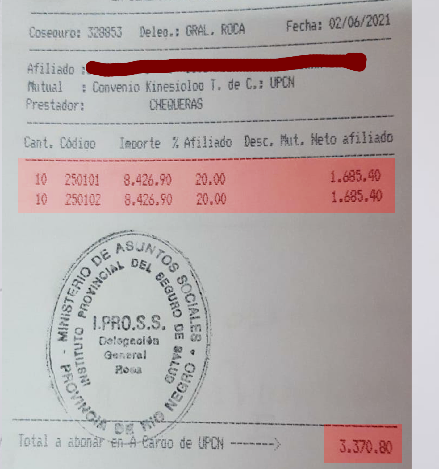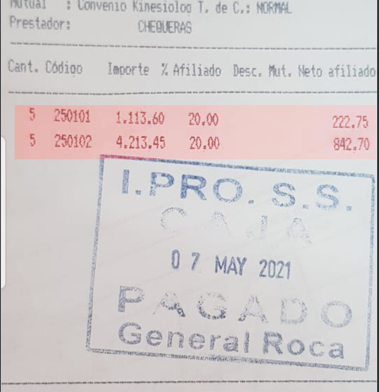 Sin embargo, a un afiliado que gestionó el 7 de mayo pasado su autorización en la delegación roquense, le facturaron 222,75 pesos por el código 250101 y 842,70 pesos por el código 250102, algo que lo llevó a pagar 1.065,45 pesos de coseguro por cinco sesiones.