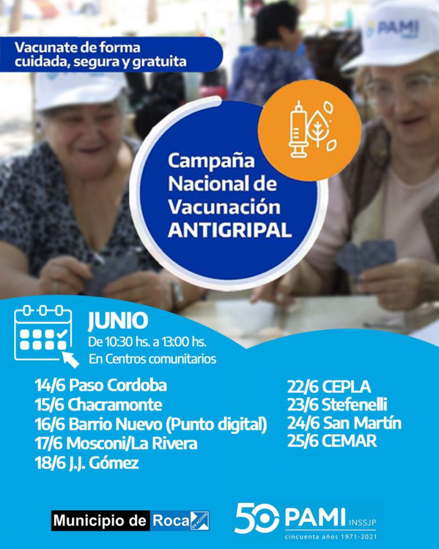 El lunes 14 de junio el operativo se iniciará en el Centro Comunitario Paso Córdoba; el martes 15 en Chacra Monte; el miércoles 16 en Barrio Nuevo; el jueves 17 en Mosconi; el viernes 18 en J. J. Gómez. El martes 22, PAMI estará vacunando en el CEPLA; el miércoles 23 en Stefenelli; el jueves 24 en San Martín; y el viernes 25 en el CEMAR.