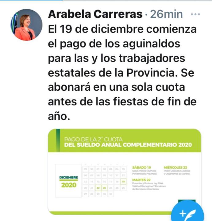 La gobernadora Arabela Carreras confirmó este martes que el próximo sábado 19 se iniciará el pago de la segunda cuota del sueldo anual complementario en Río Negro.