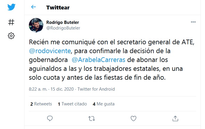 La primera confirmación llegó a través de ATE luego de recibir, en la mañana de este martes, una comunicación del ministro de Gobierno, Rodrigo Buteler y más tarde fue Carreras quien brindó precisiones con respecto a las fechas de pago.