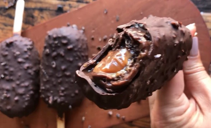 3- Derretir el chocolate con el aceite de coco o aceite común y agregar las nueces picadas. Revolver unos minutos y debe estar a temperatura ambiente. No debe estar caliente porque les va a derretir el helado y se los deforma. Escurrir, colocar sobre papel manteca o de silicona y listo.
