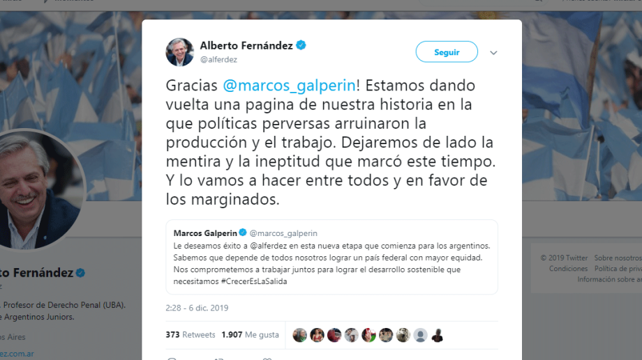 También Fernández agradeció por Twitter a Galperín, fundador y CEO de Mercado Libre, quien le había deseado «éxito en esta nueva etapa que comienza para los argentinos».