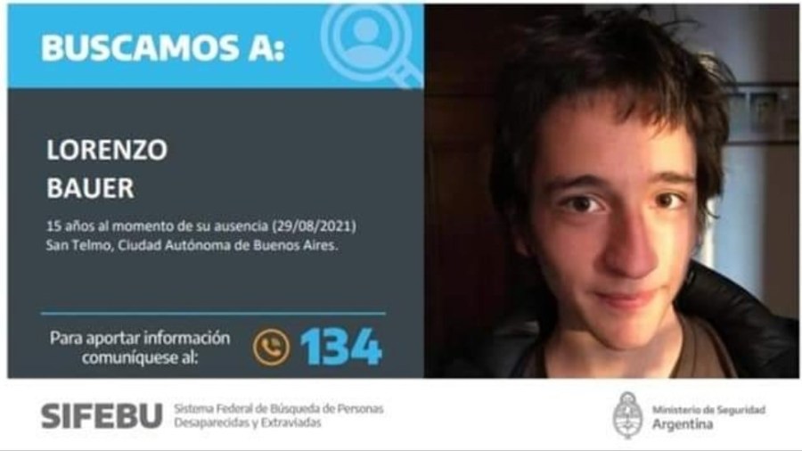 Personal del ministerio de Seguridad buscaba activamente este domingo a Lorenzo Bauer, de 15 años, quien fue visto por última vez este domingo a la madrugada tras salir de su domicilio en San Telmo, ciudad de Buenos Aires.
