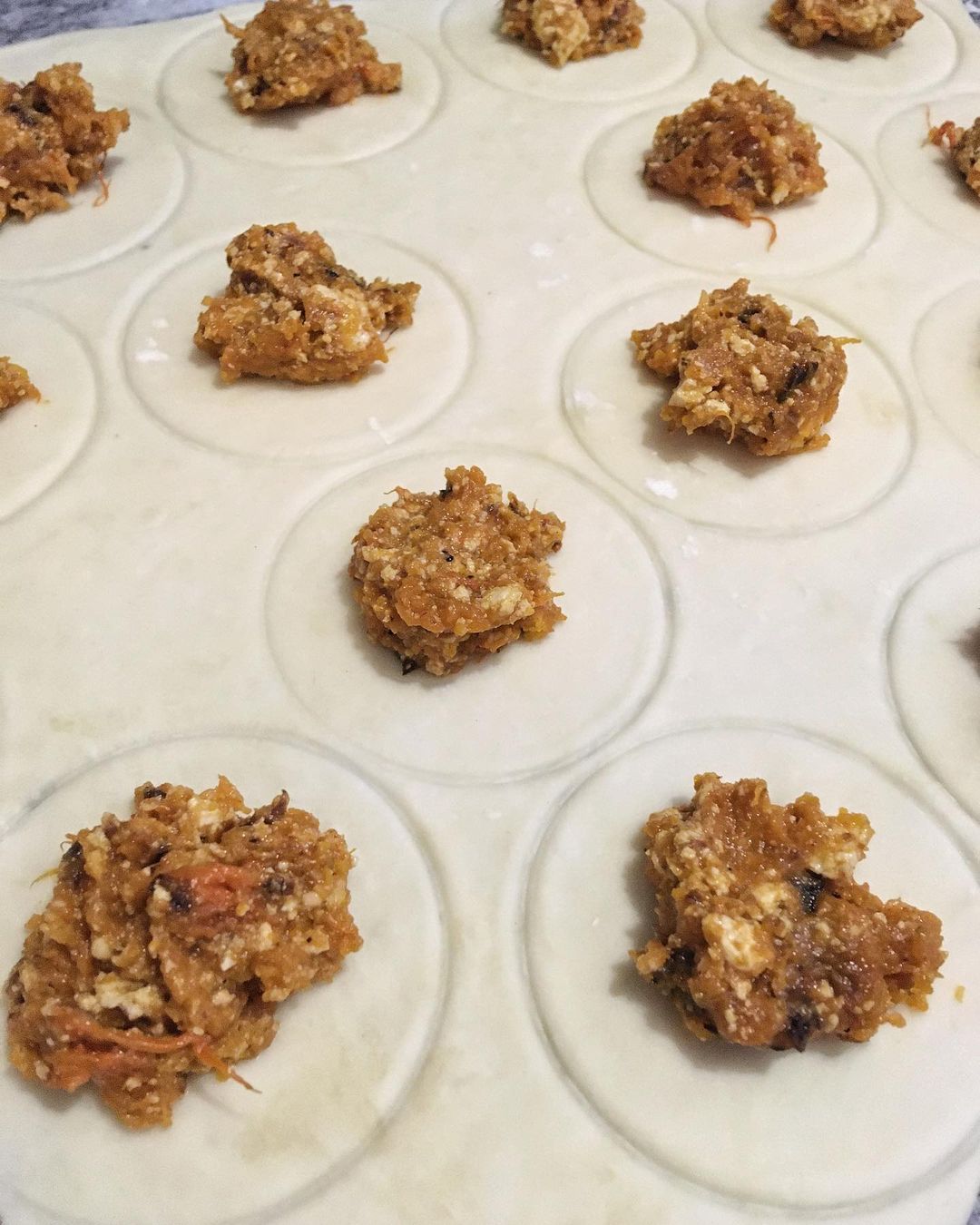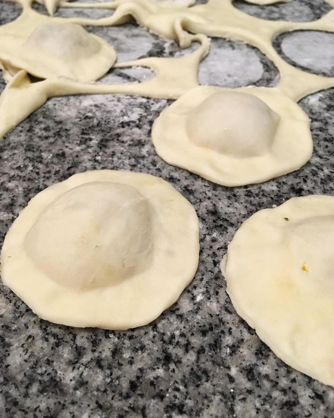 A cada círculo ponele una cuchada del relleno en el centro y mojá el borde de cada círculo con agua (para que después se pegue la masa). Colocá la otra masa arriba y presioná con los dedos (donde no hay relleno obvio) pegando la masa. Con el mismo cortante, corta círculos donde ves la montañita de relleno. Con los dedos presioná bien cada uno para cerrarlo y que no se abra en la cocción. Cocinalos en agua hirviendo, por unos 4-5 minutos. Y listooo!