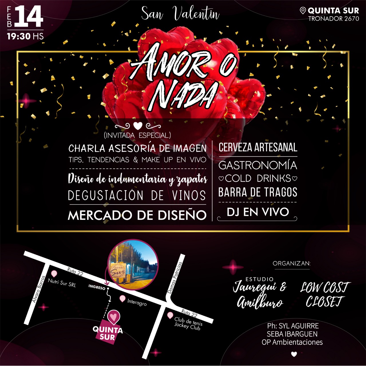 “Queremos sorprender a todos con la idea de combinar San Valentín y anti San Valentín con la frase Amor o Nada, apuntando a quienes estén en pareja o solos. Se podrá disfrutar de un mercado de diseño que incluye zapatos exclusivos, línea de indumentaria, charlas de asesoría de imagen, make up en vivo”, dicen las organizadoras a “Yo Como”.