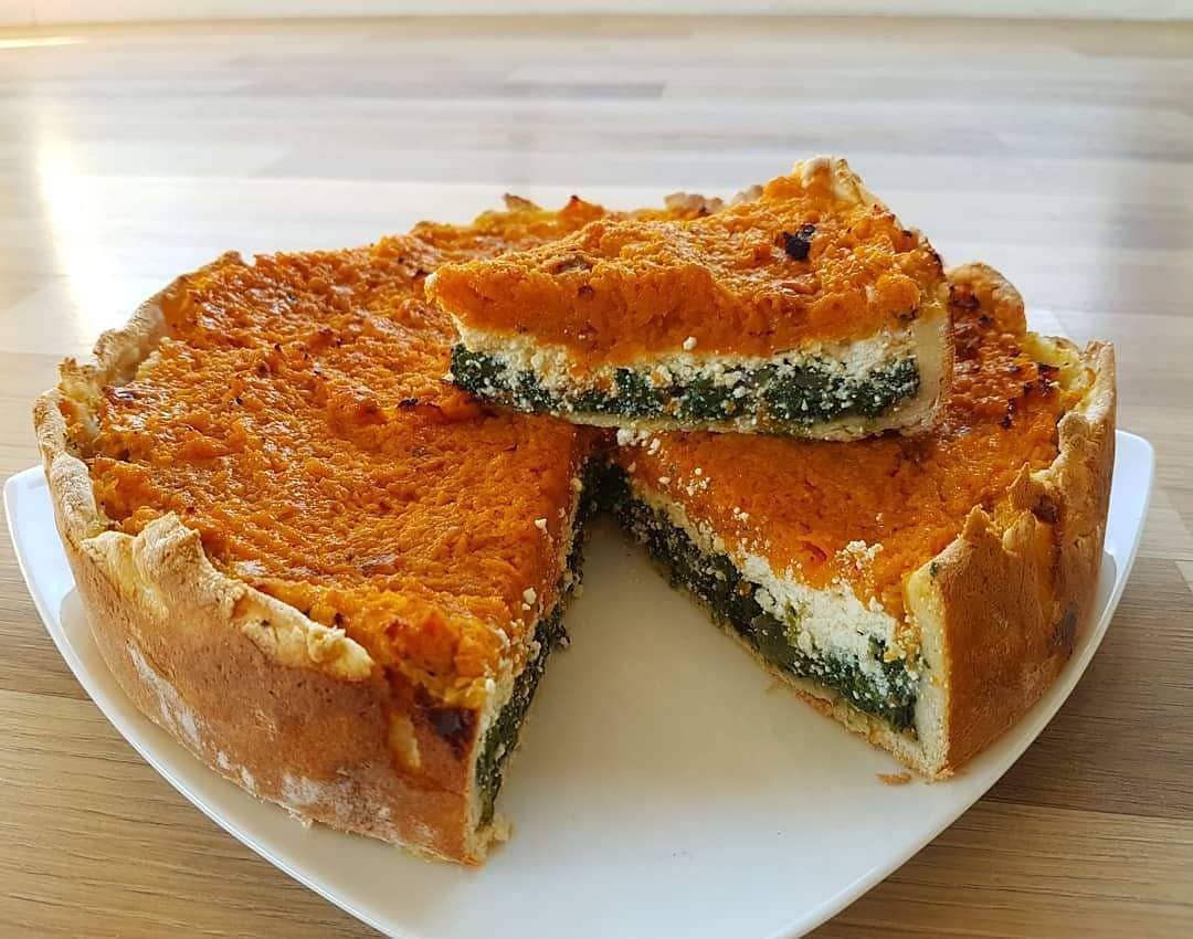 Ponemos la masa de tarta en la tartera o molde y colocamos una base de queso rallado sobre la masa. Esto para que absorba el líquido que pueda largar el relleno. Ponemos primero la espinaca, luego la ricotta y por último la calabaza. Unas fetas de mozzarella y mandamos al horno precalentando unos 40 minutos a 200° C o hasta que la masa esté cocida y dorada.