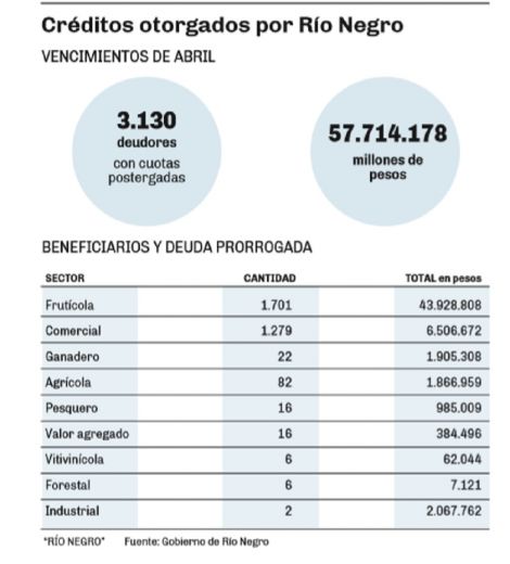 En principio, la administración rionegrina aplazó los vencimientos de abril de los préstamos de Río Negro Fiduciaria y del Crear, centrado en los sectores frutícolas y comerciales, con más del 95% de los 3.130 deudores totales. El resto de los créditos se dividen entre ganaderos, agrícolas, pesqueros, forestal y vitivinícolas.