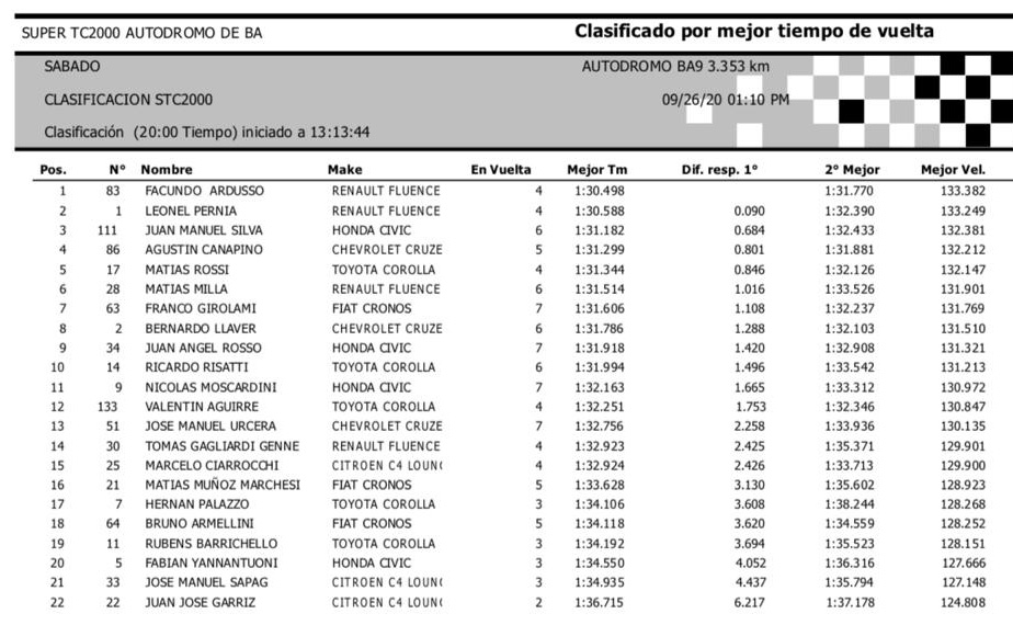 El Flaco Ardusso se quedó con la pole después de registrar un tiempo de 1m 30s 497100, después de superar a Pernía, su compañero de equipo en Renault, por apenas 9/100, y a un sorprendente Juan M. Silva, por 68/100.