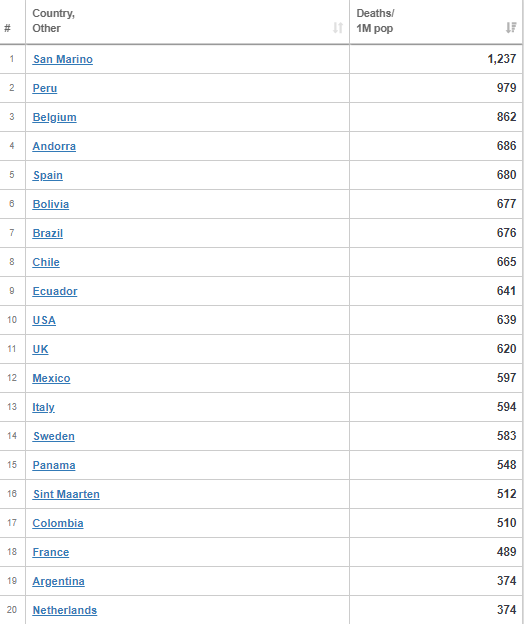 Luego de los más de 14 mil de hoy, se superó la cifra de 750 mil casos en total. En el listado de muertes cada millón de habitantes está 20°.
