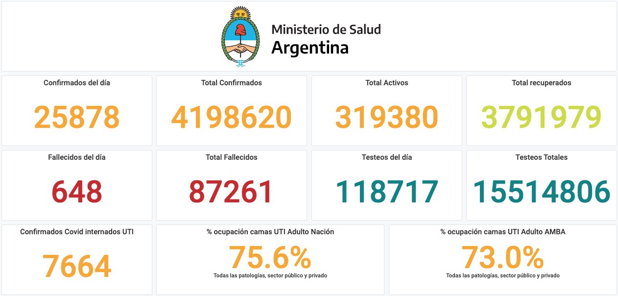 El Gobierno nacional informó que en las últimas 24 horas se reportaron 648 fallecidos, un indicador que se mantiene alta pese a la baja de contagios. De esta forma, el país superó la barrera de los 87.000 muertos por la pandemia. Con los últimos datos, el país ya cuenta con 87.261 muertos.