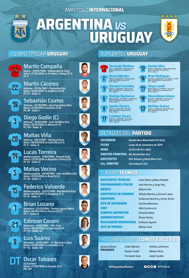 Uruguay, por su parte, inició la fecha FIFA con una victoria ante Hungría por 2-1 (goles de Cavani y la joven promesa Brian Rodríguez) en Budapest y hoy pondrá en juego un invicto de 12 partidos.