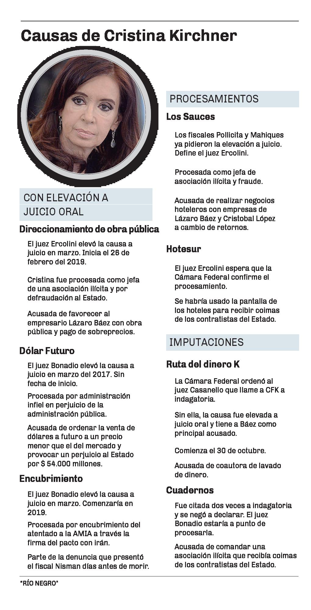 Nadie, ni en Comodoro Py ni en el entorno de Cristina Kirchner, duda de que el juez Claudio Bonadio la procesará pronto en la megacausa de los Cuadernos de las coimas. Como Bonadio es más flexible que otros de sus colegas en lo que a tiempos se refiere, la cuestión ahora es cuándo, pero se especula con que se produciría esta misma semana, incluso en las próximas horas. En paralelo, luego de un pedido expreso de la Cámara Federal, la ex presidente deberá presentarse este martes ante el juez Sebastián Casanello para prestar declaración indagatoria en la Ruta del dinero K, caso por lavado en el que está detenido Lázaro Báez. Fernández de Kirchner afronta a esta altura siete causas pesadas, con el blindaje de los fueros del Senado frente a cualquier pedido de detención.