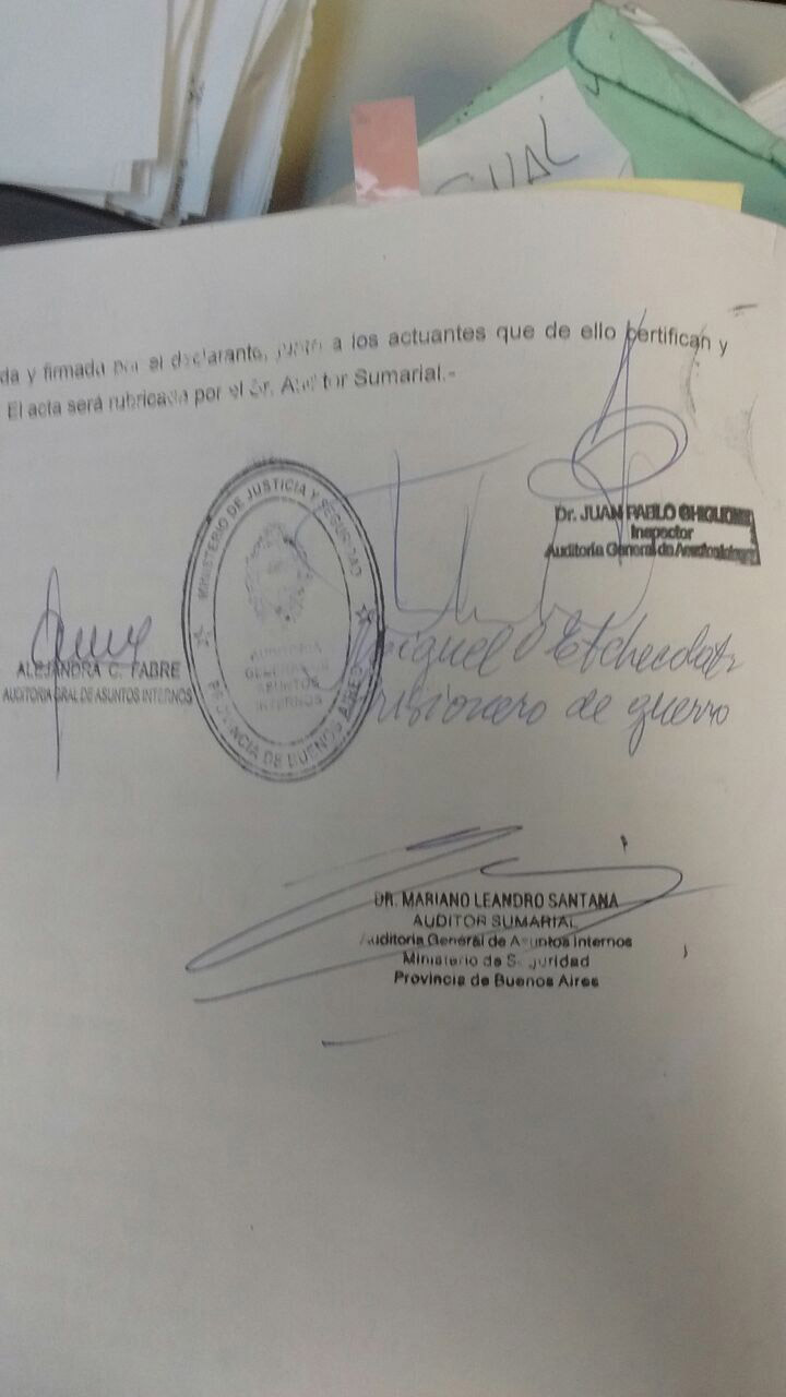 Fuentes de la cartera de Seguridad precisaron a Télam que, al notificarse de su exoneración, Etchecolatz firmó y debajo escribió “prisionero de guerra”.