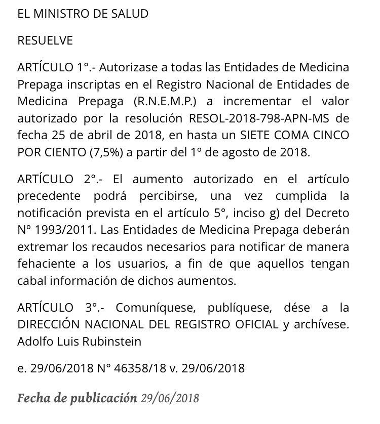 El Gobierno Nacional autorizó a las empresas de medicina prepagas a aplicar un incremento del 7,5 por ciento en sus cuotas a partir del 1 de agosto.