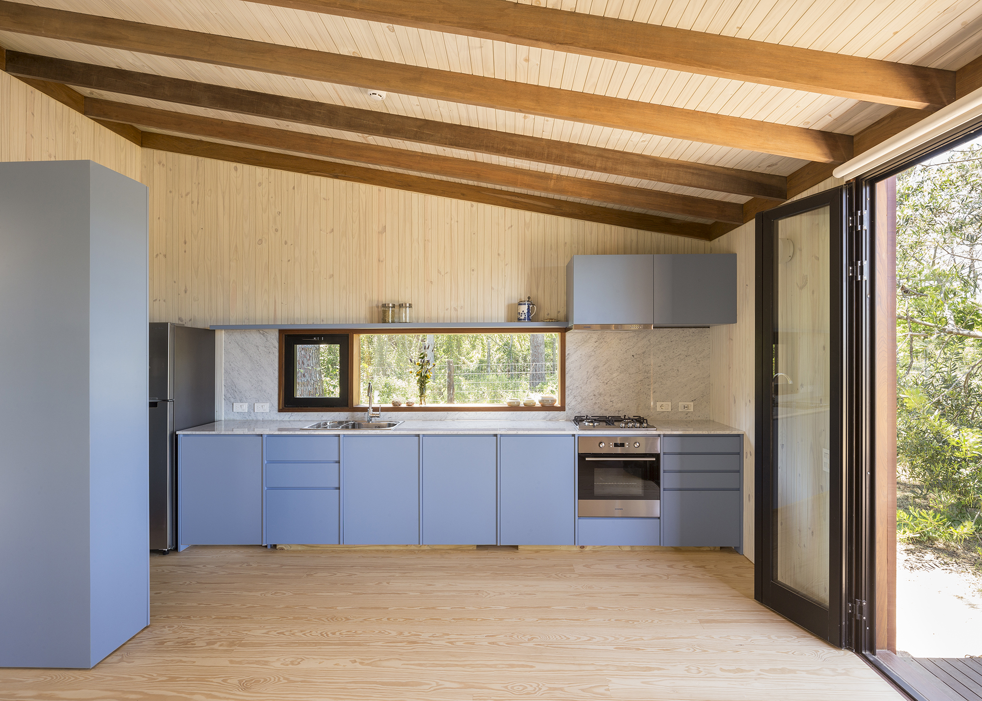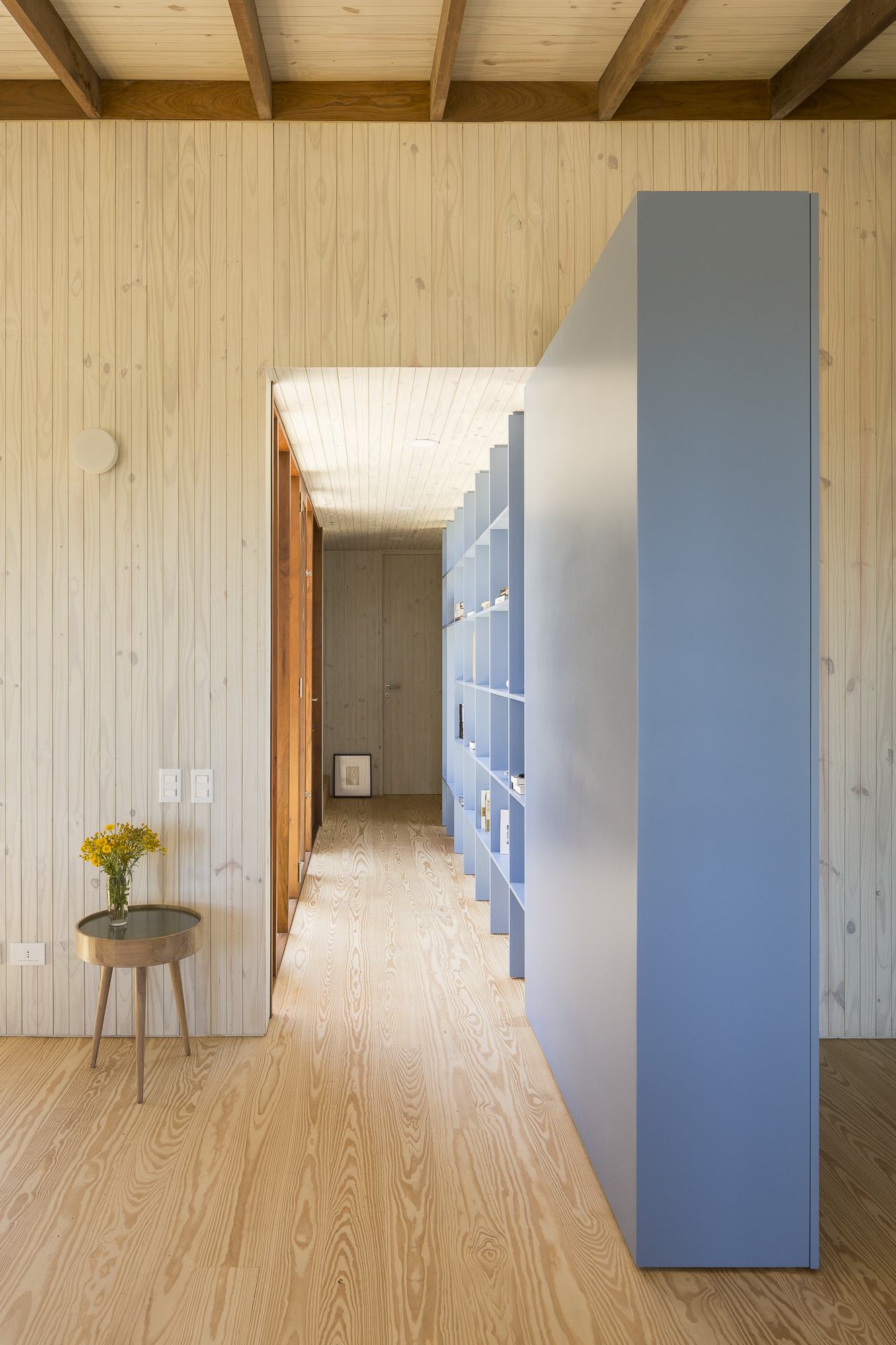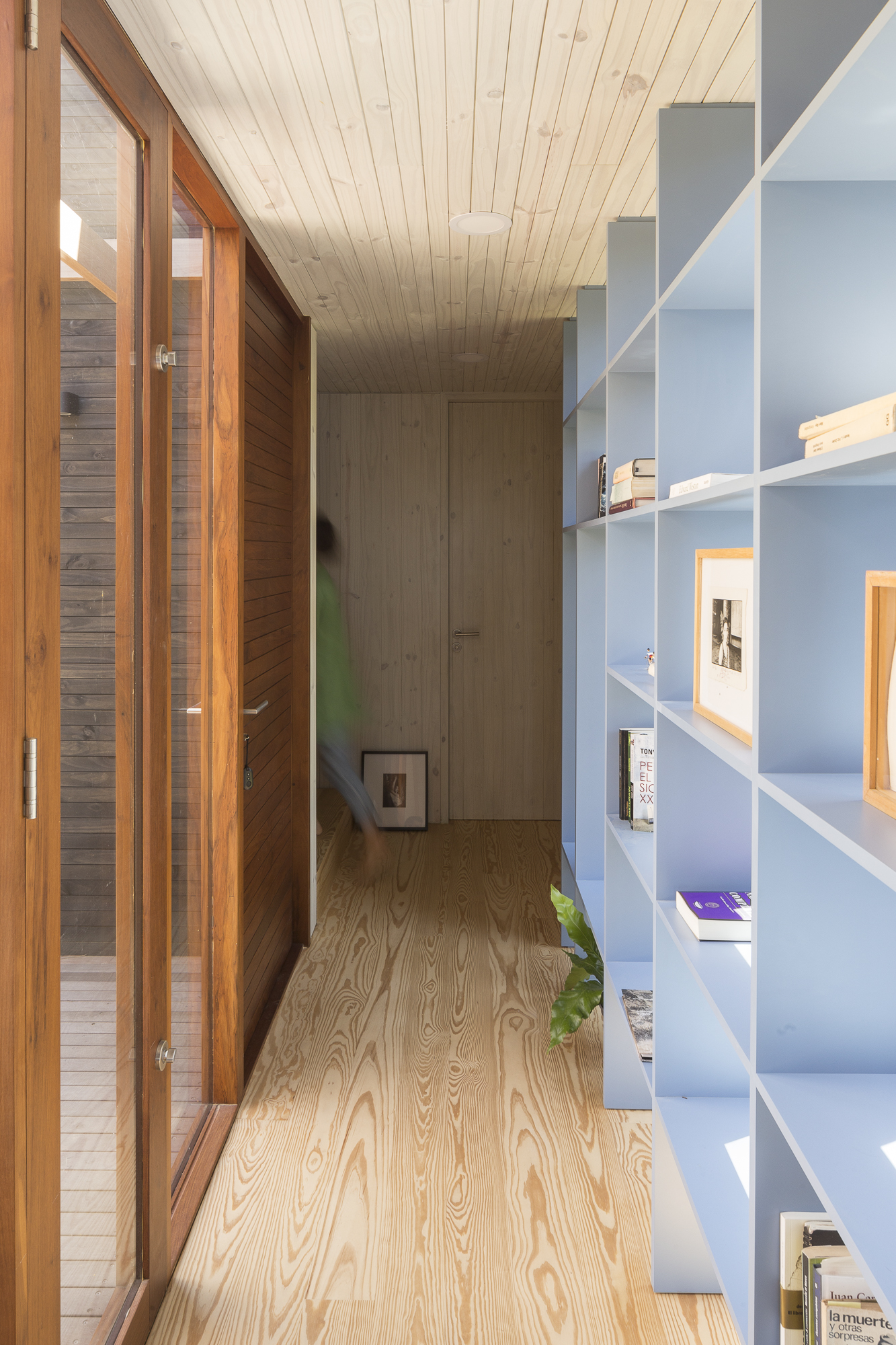 Un puente conector vincula ambos cuerpos a la vez que oficia de acceso a través de la galería norte. Los dos volúmenes se desfasan en planta para garantizar iluminación a la galería y visuales al mar desde el dormitorio ubicado en planta alta.