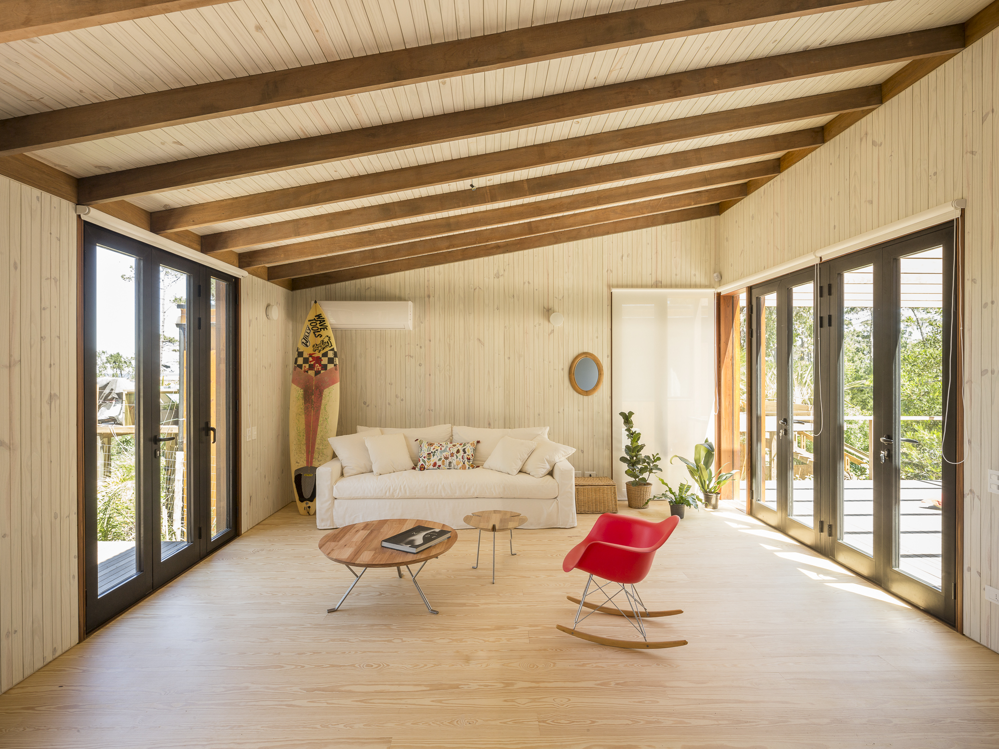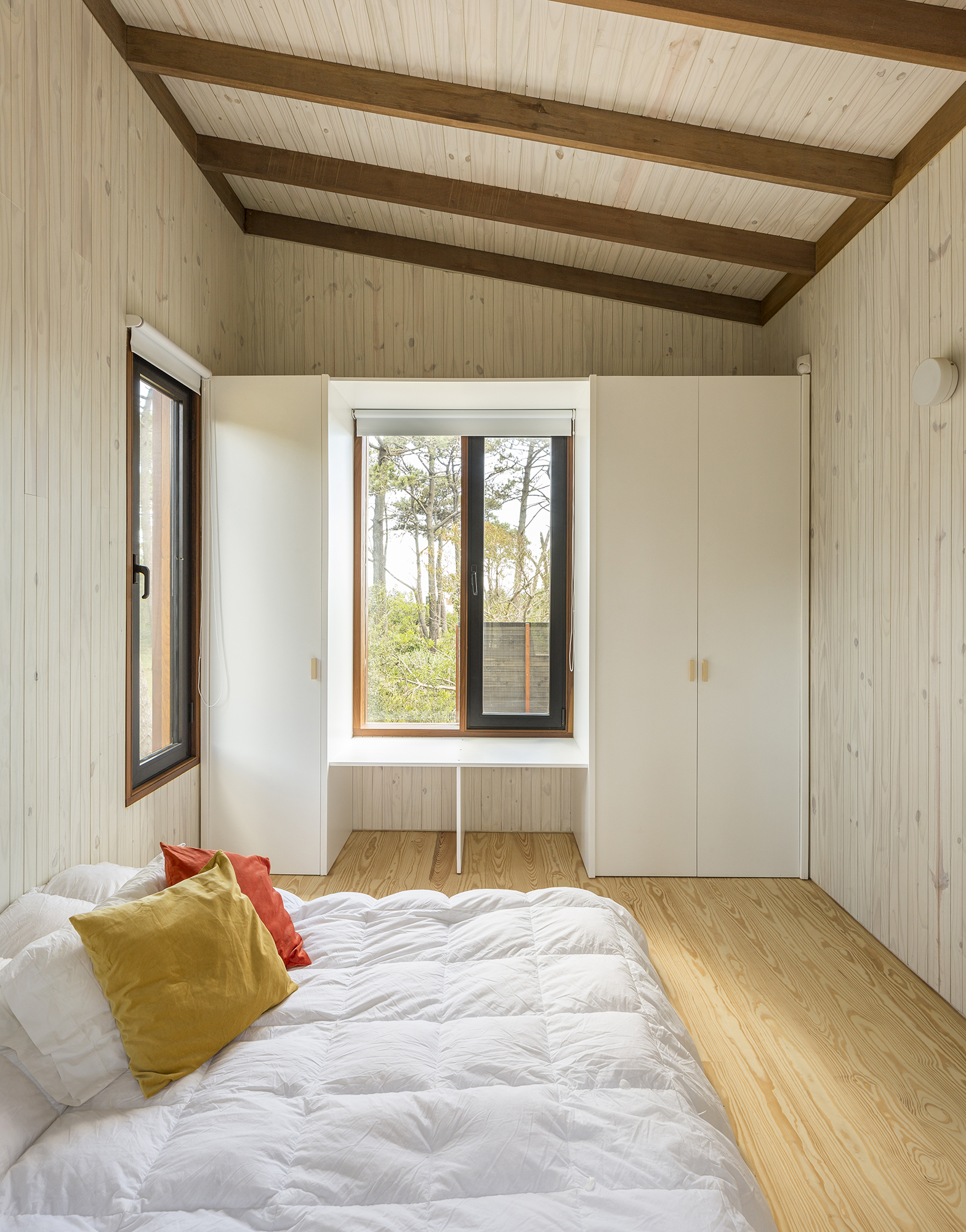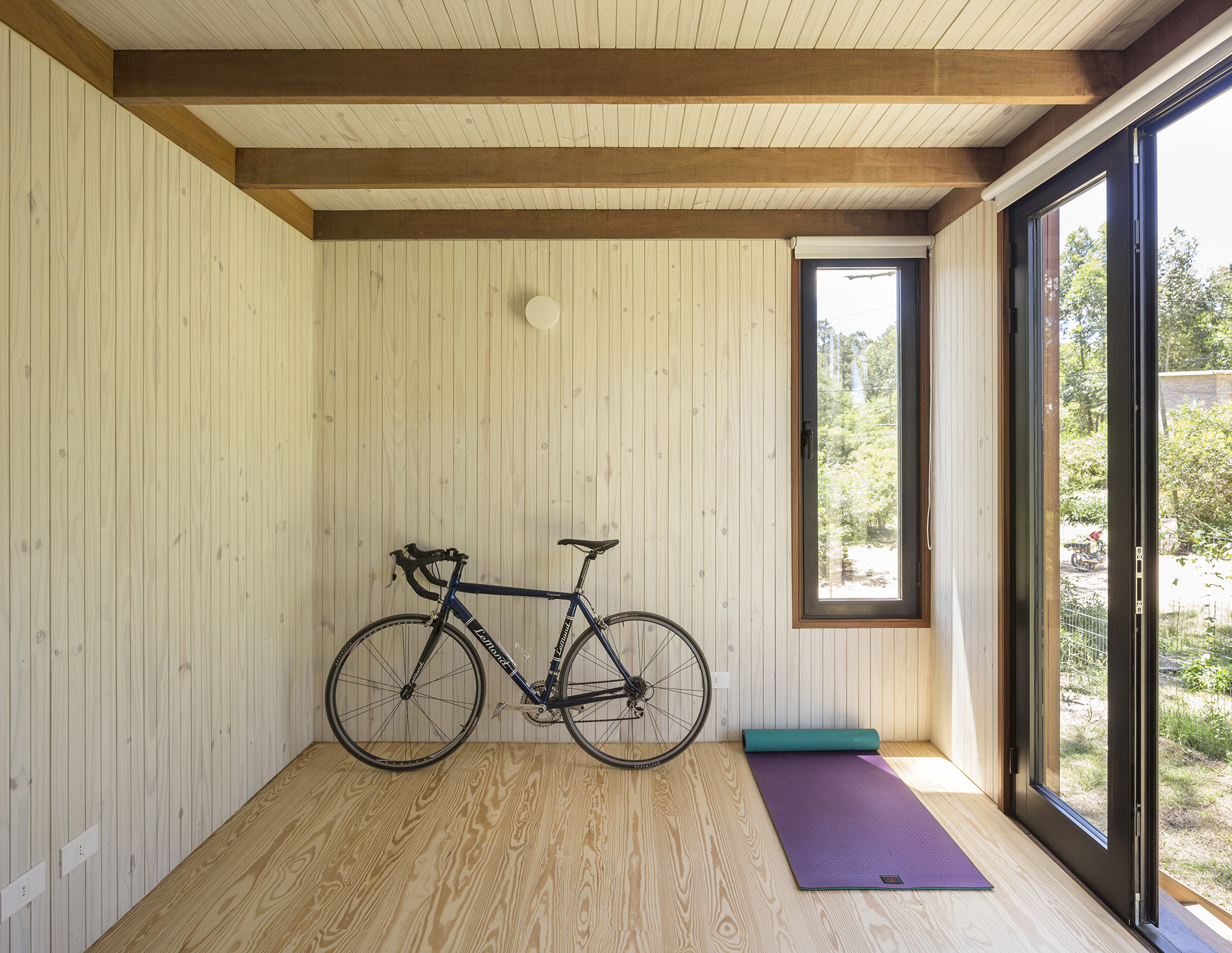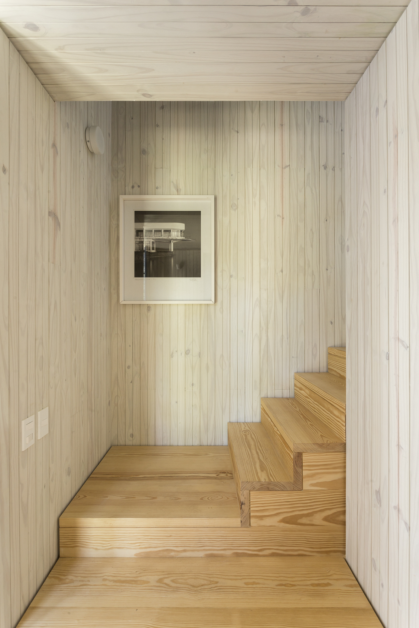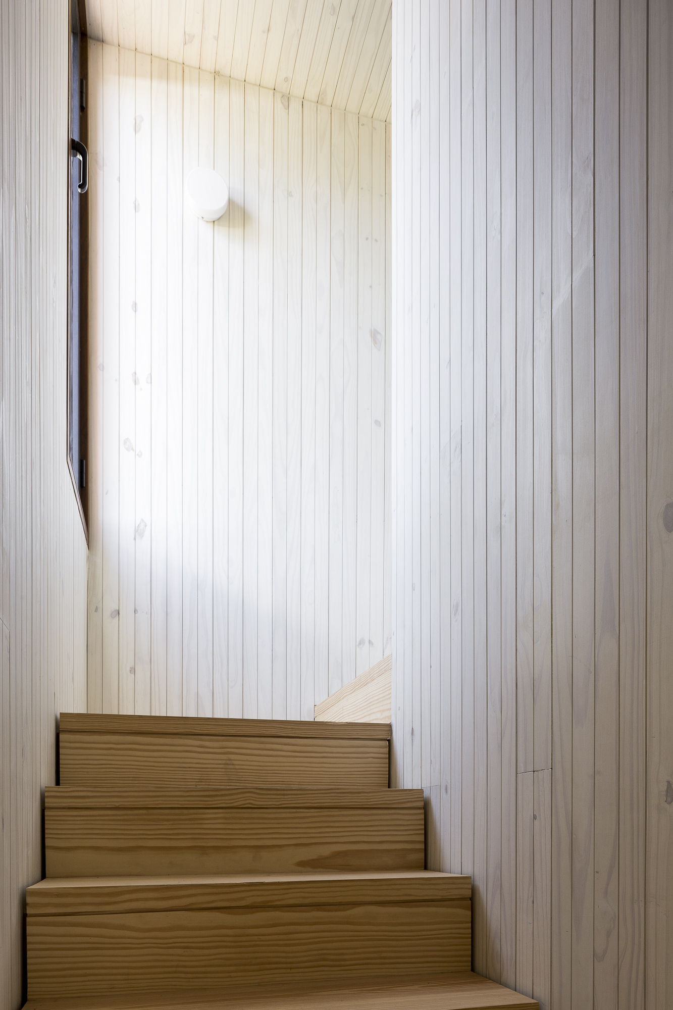 Un conjunto de verticales de madera dura dispuestas cada 2 pies garantiza la rigidez del revestimiento exterior de machimbre de pino teñido en aceite. De esta manera el lenguaje exterior supone la expresión directa de la modulación constructiva y material.