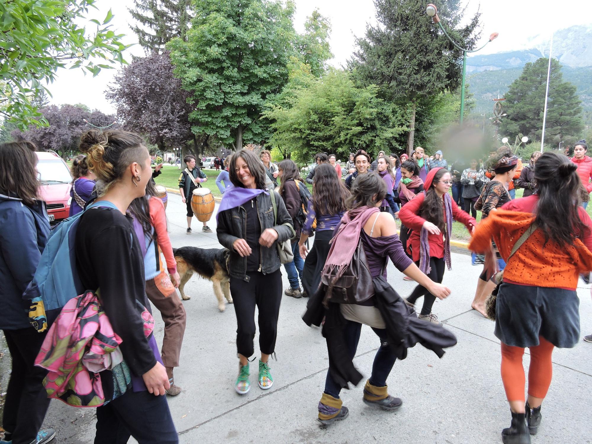 Al ritmo de batucada, cánticos y coreografías, cerca de un millar de mujeres marcharon hoy por la calles céntricas de El Bolsón, para terminar con una concentración frente al mural dedicado a Otoño Uriarte en plaza Pagano.