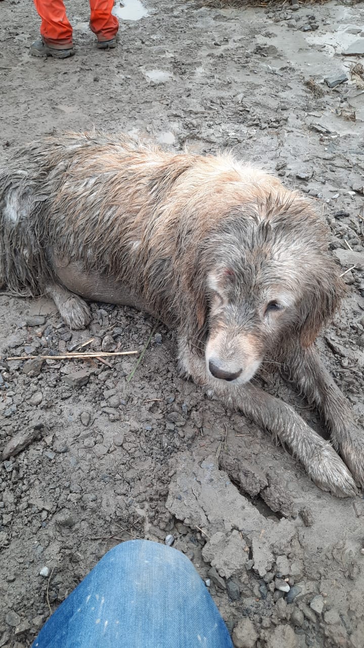 La perra, totalmente cubierta de barro, se encuentra en el obrador de la empresa a la espera de sus dueños.