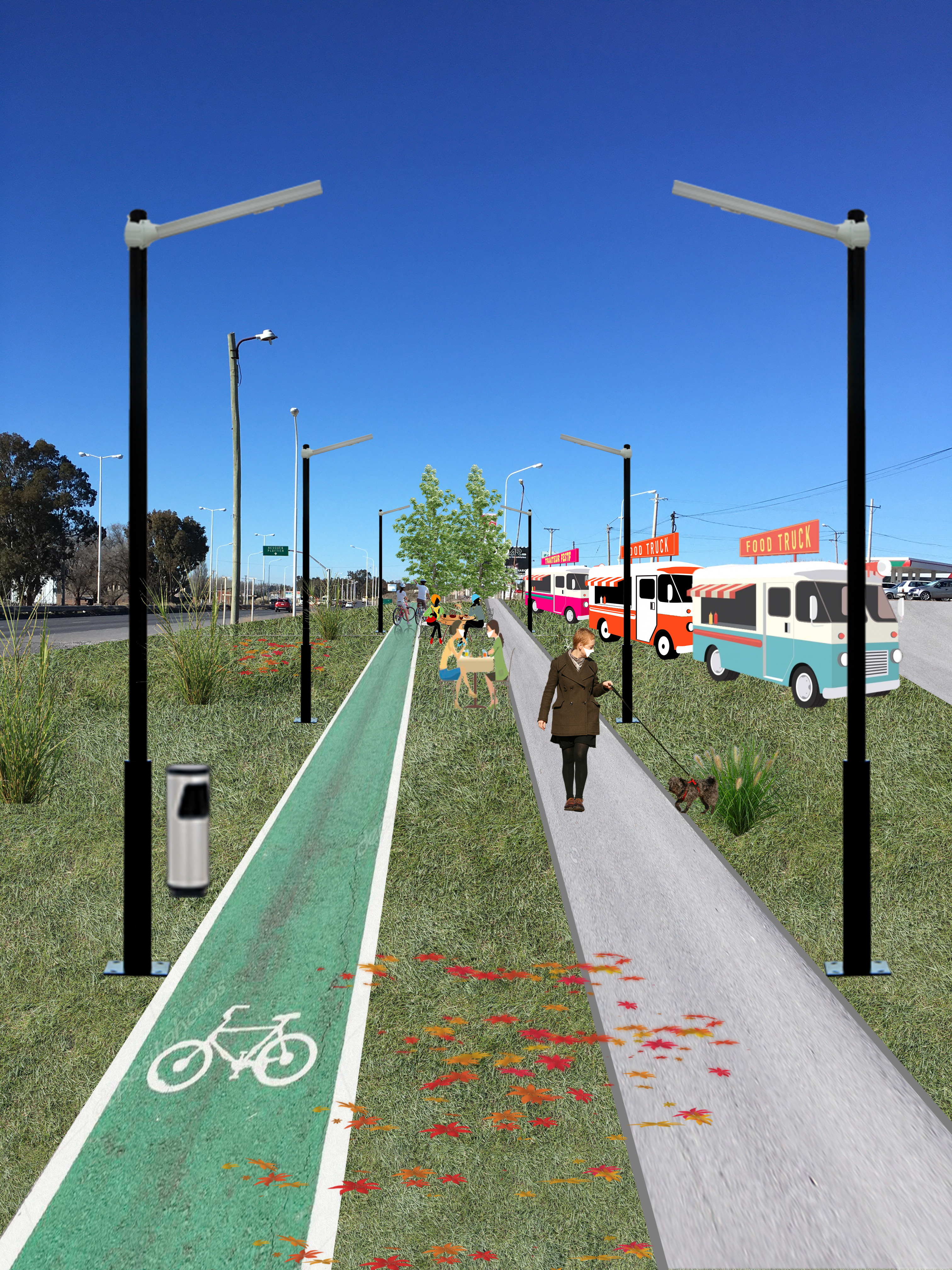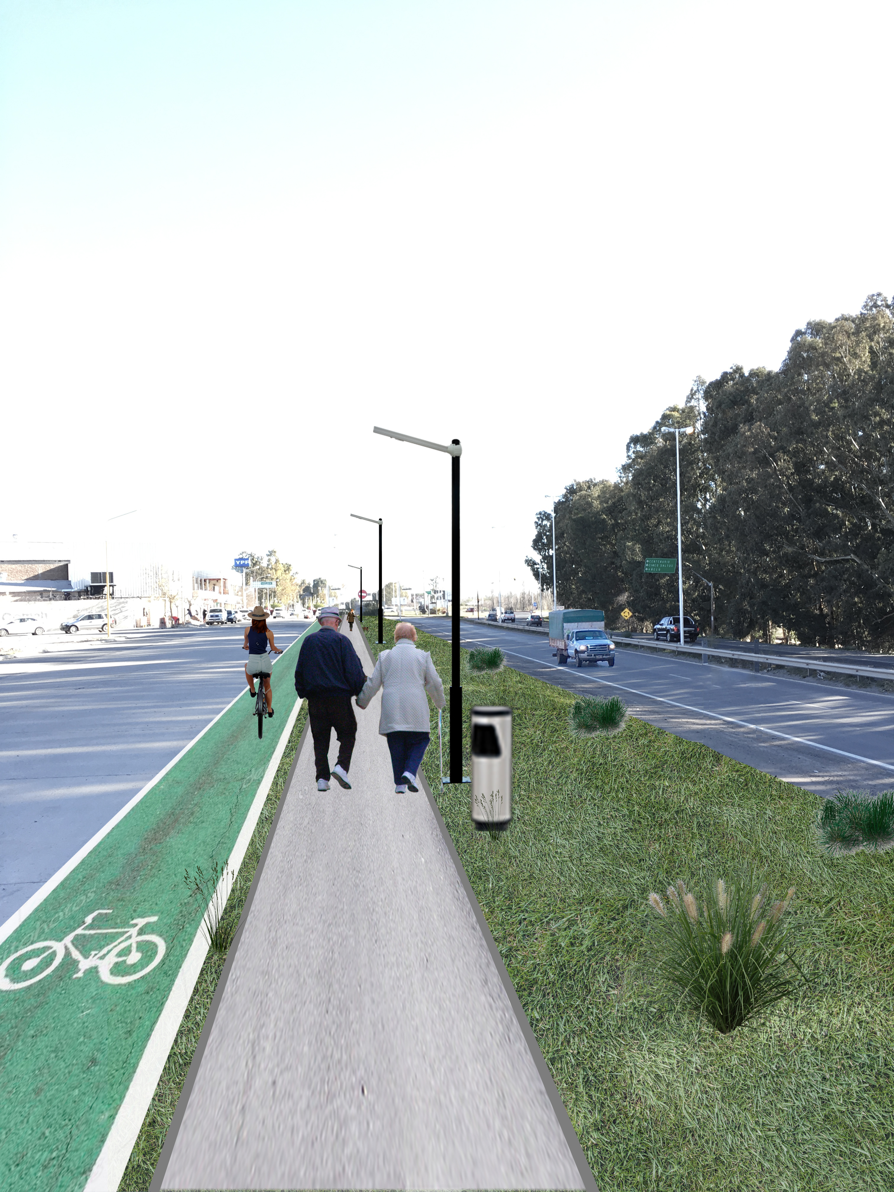 Una de las vistas que anticipa el anteproyecto de urbanismo táctico “Parque Lineal Ruta 7” que el COPADE diseñó para Centenario.