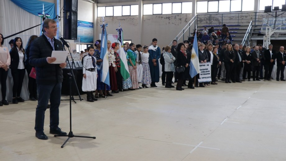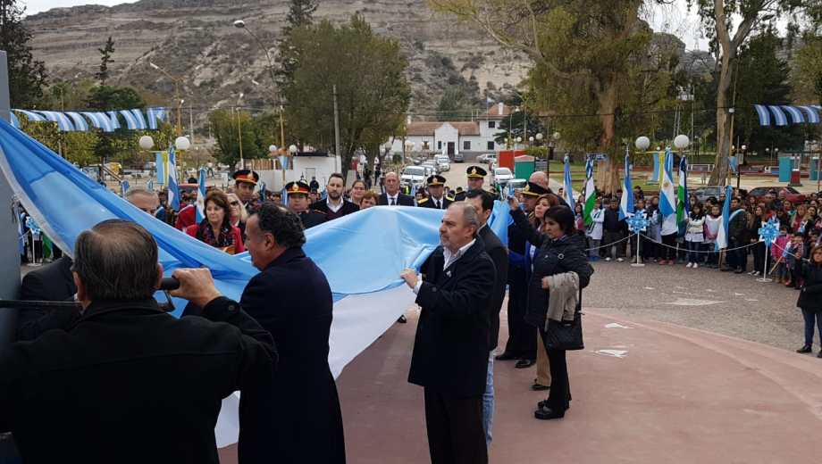 Más de 50 banderas le dieron color al acto del 25 de Mayo en Villa Regina. El intendente Carlos Vazzana realizó el izamiento de la bandera acompañado de distintas autoridades.