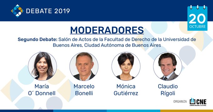 Está confirmada la presencia de Alberto Fernández (Frente de Todos), Mauricio Macri (Juntos por el Cambio), Roberto Lavagna (Consenso Federal), Nicolás Del Caño (FIT), Juan José Gómez Centurión (Frente Nos) y José Luis Espert (Unite). En caso de inasistencia, la persona ausente será penada.