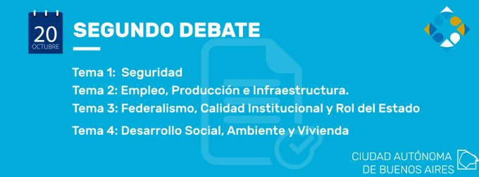 Cabe recordar que los candidatos no podrán interpelarse directamente entre ellos, y que en cada eje temático tendrán un tiempo de exposición de dos minutos, un espacio de intercambio de treinta segundos y otros treinta para la respuesta o cierre. Y en última instancia tendrán un minuto para la conclusión. Los temas previstos para hoy son los siguientes: