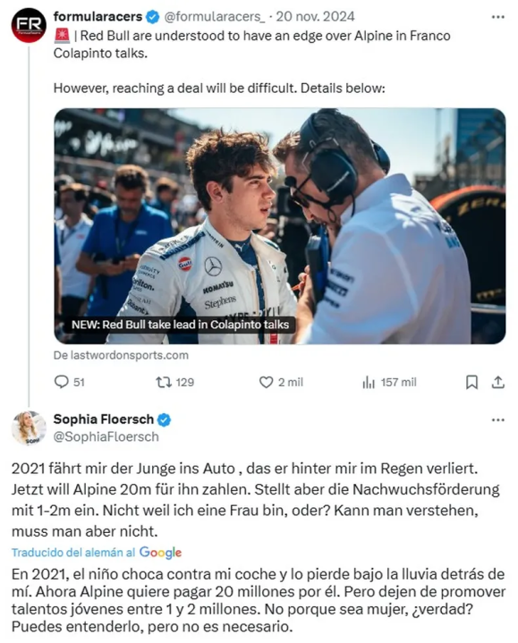 Se trata de Sophia Floersch, quien participa de la academia del equipo. En redes sociales, respondió a una publicación en la que hacía referencia a la disputa entre Red Bull y Alpine por hacerse de los servicios del joven de 21 años en sus respectivas escuderías.