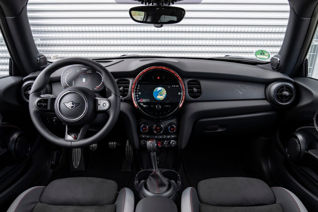 El típico instrumento central de Mini retoma el mismo diseño y, junto con la iluminación ambiental roja, crea un gran contraste con el revestimiento del techo de color antracita. Los radios inferiores del volante deportivo y las alfombras también lucen el emblema Mini John Cooper Works 1to6 Edition.