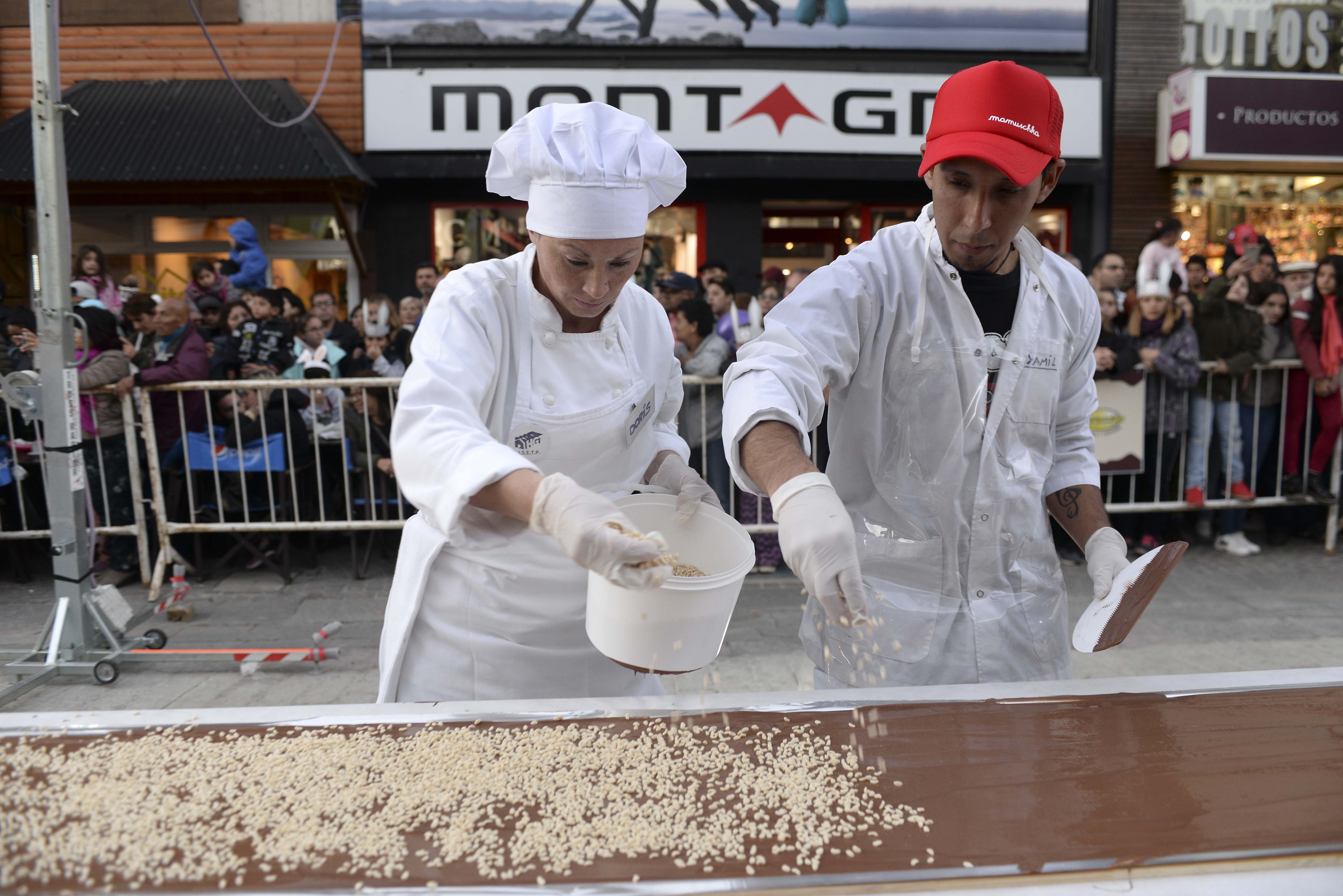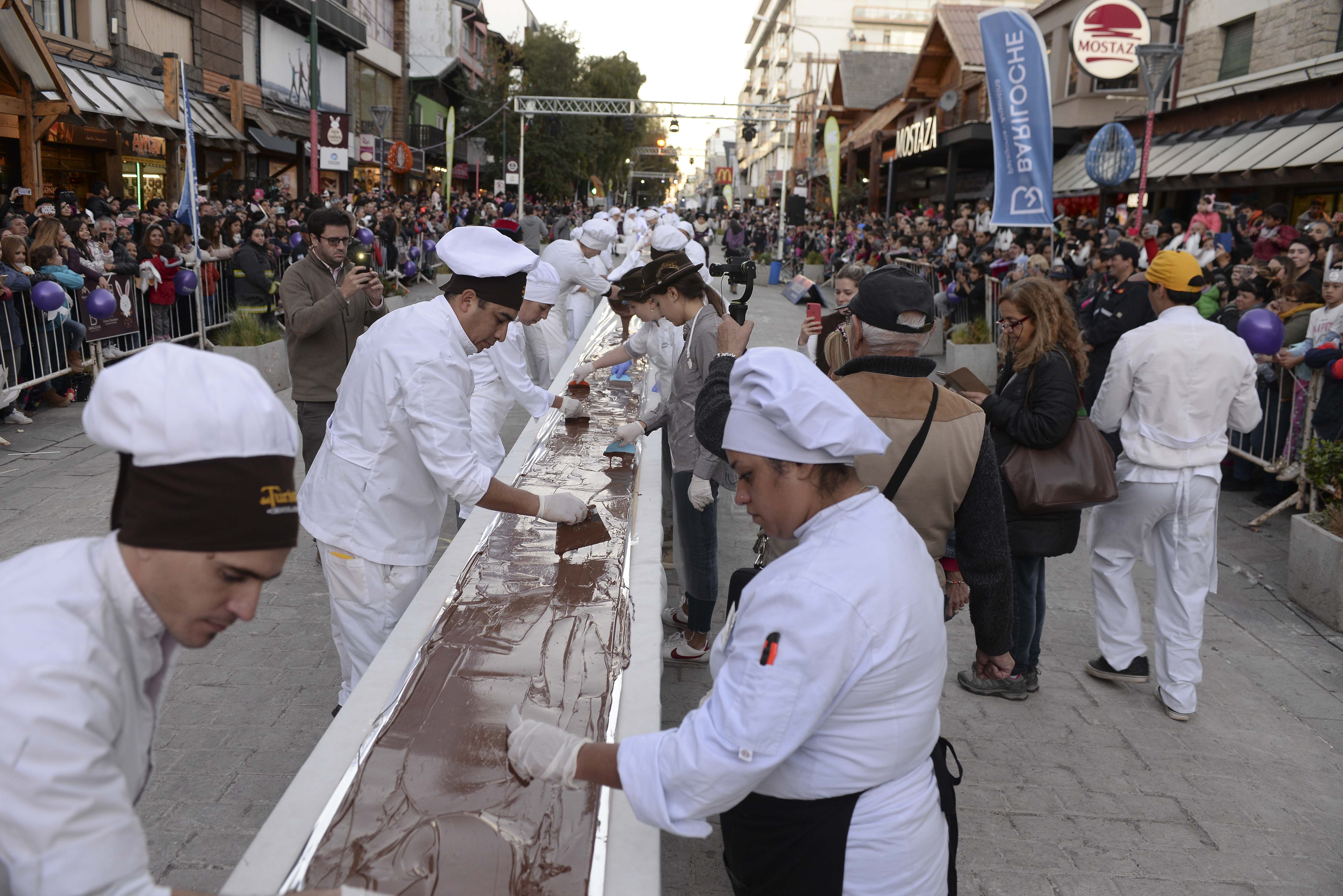 En un extenso molde de poco más de 200 metros, los maestros chocolateros de Bariloche y decenas de colaboradores, elaboraron esta tarde a la vista de miles de personas la barra de chocolate más larga del mundo.