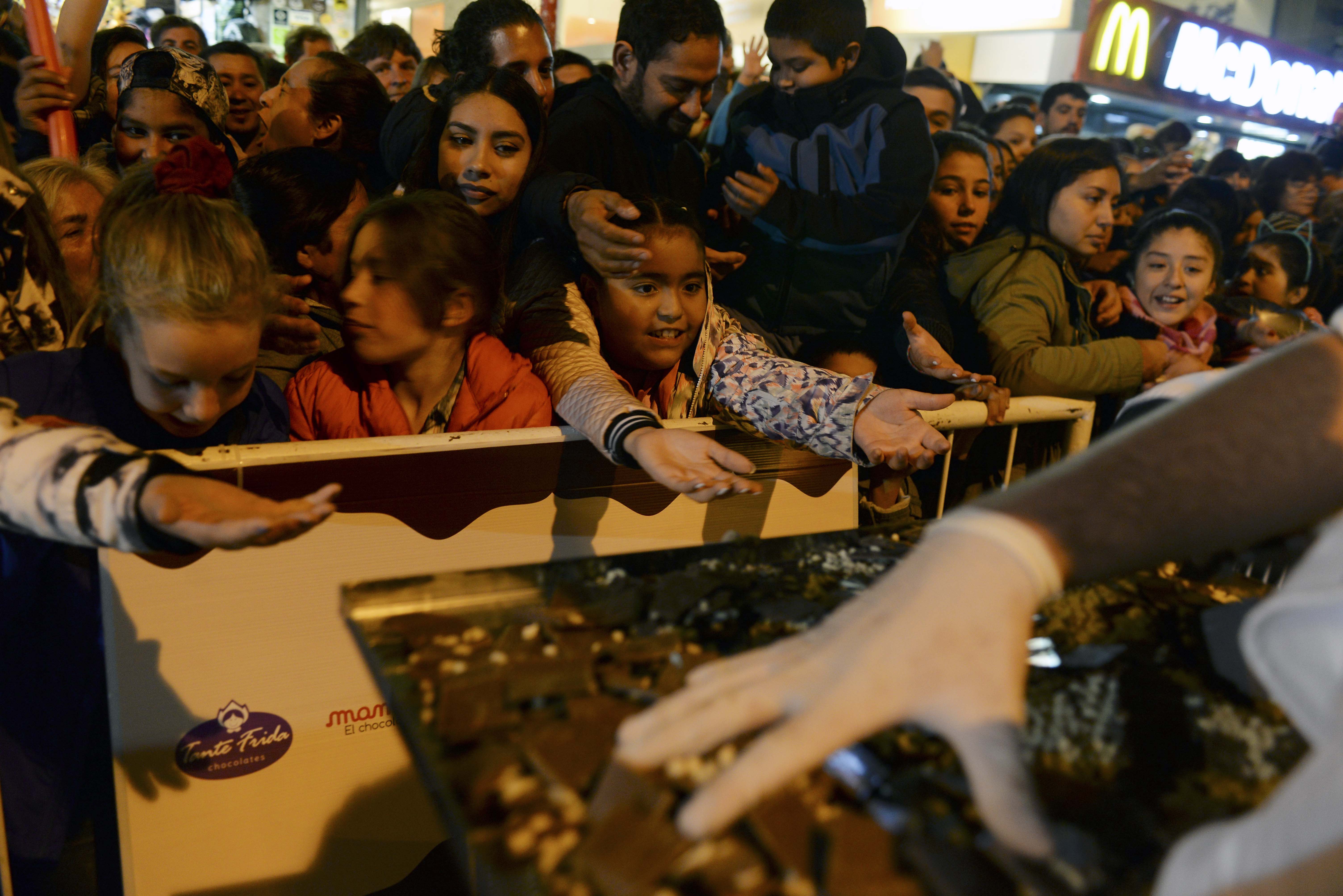 Se repartieron 20.000 porciones. Unos 180 maestros chocolateros y estudiantes de la Escuela de Hotelería y Gastronomía trabajaron en su elaboración en la calle Mitre esta tarde.