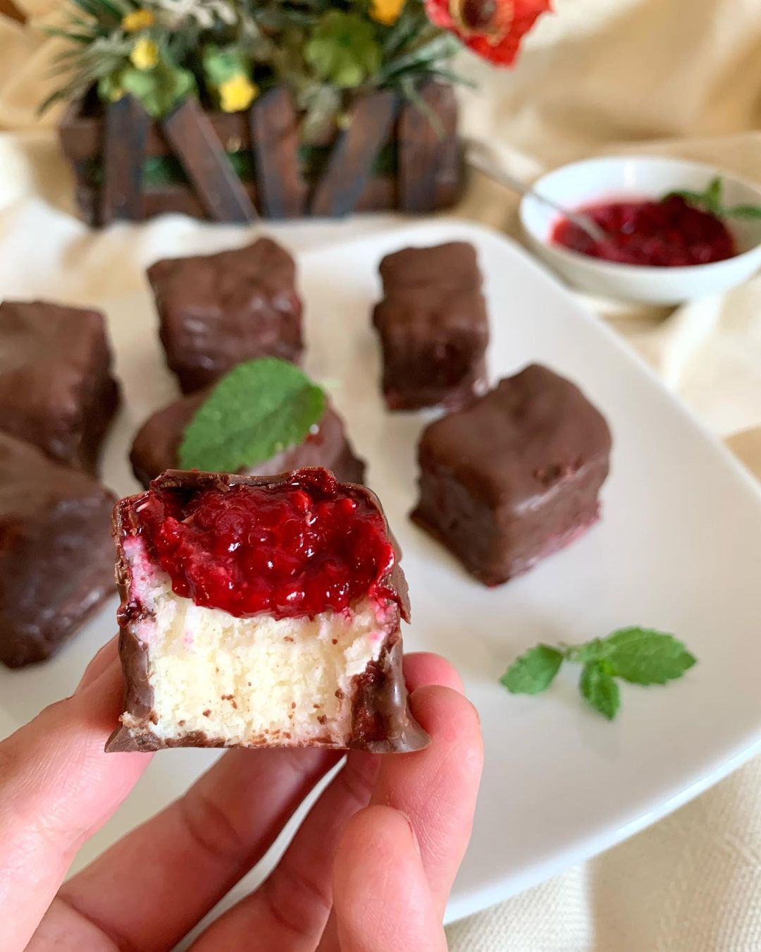 Bocaditos de coco, frambuesa y chocolate